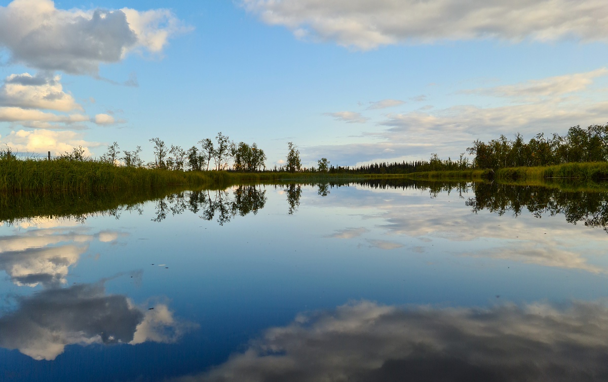 | Auf den letzten ca. sieben Kilometern unserer Tagesetappe war der Fluss ein langsam dahinfließendes Gewässer. Die Fahrt zog sich dahin und es kam uns vor, als ob wir auf einer Autobahn sind. Da das Flussufer ungefähr 60cm hoch war, konnten wir nichts anderes als den 20m breiten, bewaldeten Randstreifen sehen. Zum Glück kam die Sonne ab und zu heraus und wir hatten größtenteils Rückenwind. Unser Ziel war ein See, an dem wir auf einen guten Zeltplatz hofften. |