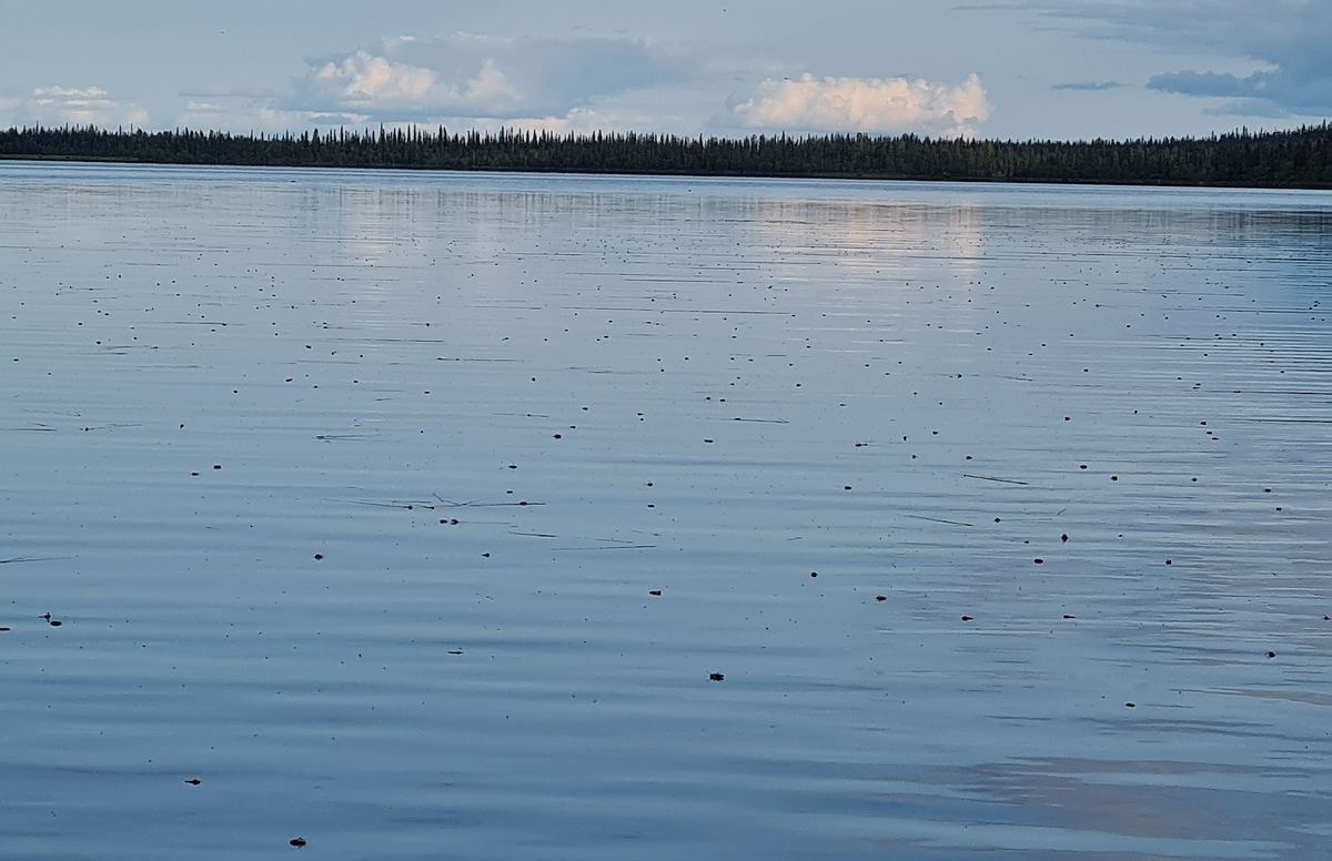 Die Sonne schien auf unser Zelt und schnell war die Nacht vergessen. Im Schatten der Bäume lag Rauhreif auf den Sträuchern und unsere Watschuhe waren gefroren. Es gab warmen Bannock zum Frühstück und wir beobachteten, wie überall Bibios aus dem Boden kamen. Heute wollten wir mehr Paddeln und hatten ca. zehn Kilometer Luftlinie vor uns. Nach dem Zeltabbau paddelten wir bei Windstille über den See und machten auf der anderen Seite eine Pause zum Hechtfischen, aber ohne Erfolg. Der Wind frischte auf und kam jetzt genau auf uns zu. Wir kamen fast nicht mehr voran, aber schafften es dennoch mit ordentlich Kraftanstrengung bis zum Auslauf des Sees. |