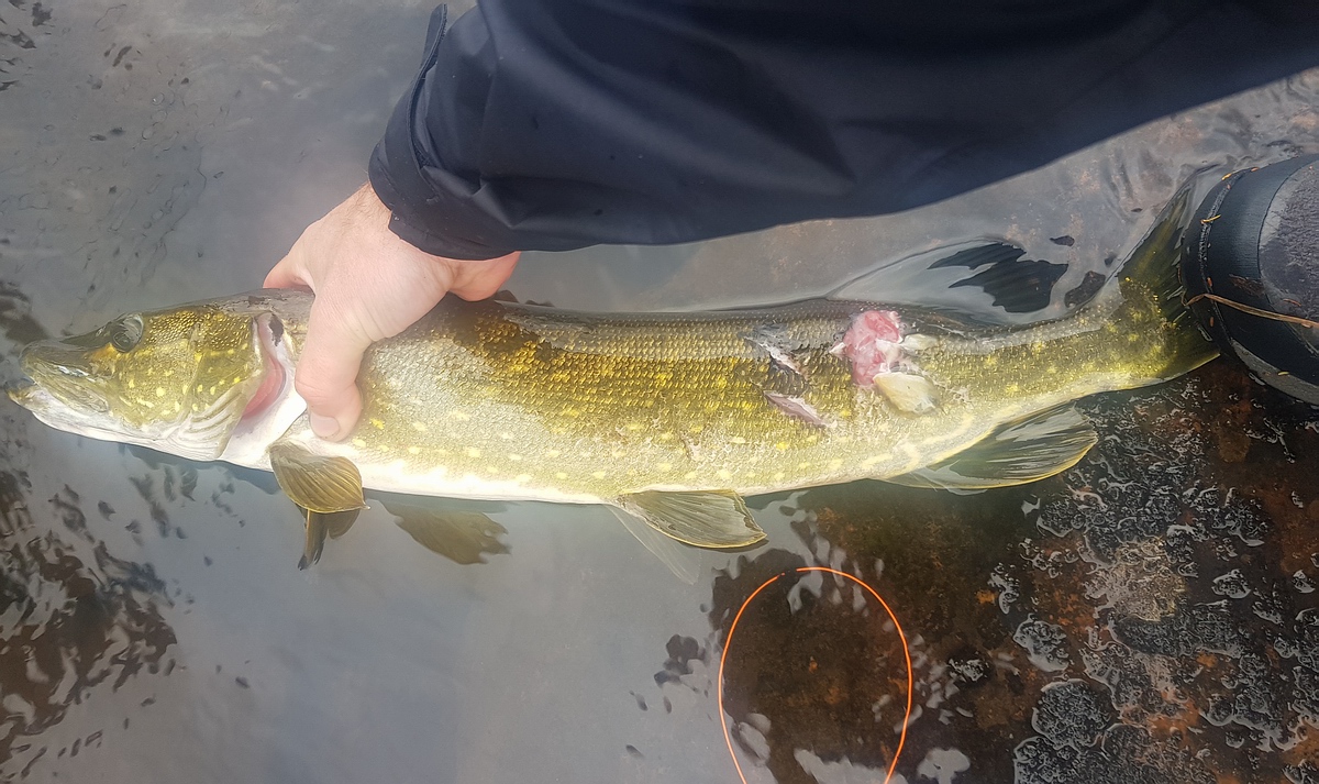 Am Morgen werden wir wieder durch die Sonne geweckt und kommen auch relativ zügig los. Die Tagesetappe bestand zuerst aus ein paar Seen mit ruhigen Flussabschnitten und endete dann in einer sehr langen Rausche, an deren Ende wir unser Camp aufschlagen wollten. Wir hatten uns entschieden, die Ruten aufgebaut zu lassen, um teilweise in den Seen auf Hecht zu fischen. Schon nach 50m machte Sven seine ersten Würfe und konnte einen halbstarken Hecht über einem Krautfeld erwischen. Im Anschluss befischten wir nochmal den Flusseinlauf vom Vortag. Leider ohne Erfolg. Daraufhin entscheiden wir uns, die Fliegen zu schleppen und Strecke zu machen. Bis auf einen Biss bei Sven blieb aber alles ruhig. Am Ende des vorletzten Sees sahen wir mehrere Fische steigen. Die Wasseroberfläche war wieder voll mit Bibios, aber leider entschied sich kein Fisch für unsere Trockenfliegen. Somit fuhren wir weiter, auch die ruhigen Flussabschnitte blieben ohne Fisch. Ich gab das Schleppen nicht auf und wurde am Ende des letzten Sees mit einem kampstarken Hecht, der meiner Fliege doch nicht wiederstehen konnte, belohnt. Nach einem kurzem Drill und Foto schwamm er auch wieder schnell davon. |