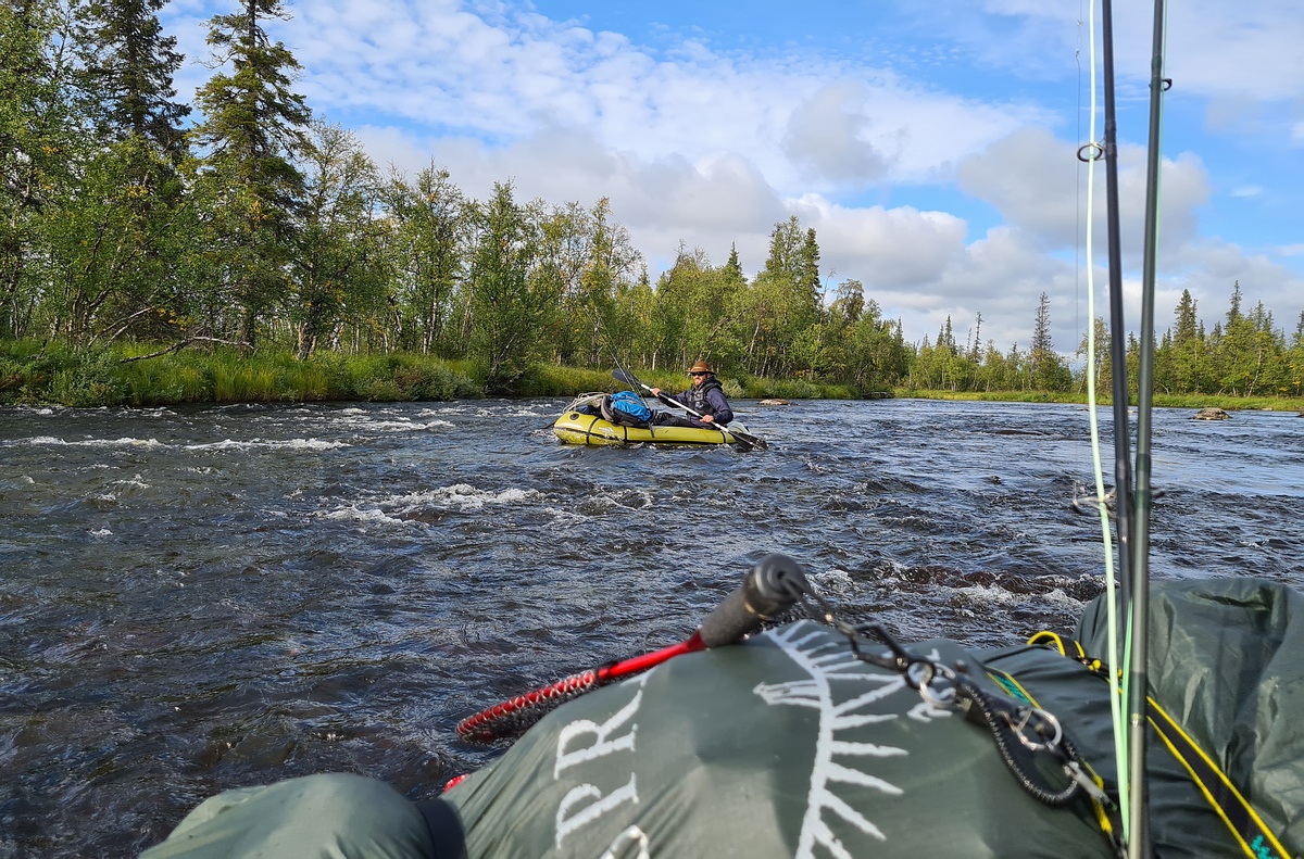 | Wir fuhren weiter und schon nach fünf Minuten wurde der Fluss innerhalb eines ruhigen Bereiches sehr schmal. Hinter der Engstelle lag ein großer, tiefer Gumpen mit einer ordentlichen Rückströmung. Wir hielten an, um diesen Bereich auf Hecht abzufischen. Es schrie hier förmlich nach Hecht. Sven konnte auch gleich einen Hecht auf Sicht anwerfen, aber leider verlor er ihn im Drill. Ich versuchte mein Glück in der Rückströmung des tiefen Gumpens. Schon der erste Wurf in die Strömung brachte ein Riesenmaul zum Vorschein. Ich setzte den Anhieb, die Rute wurde richtig krumm und ein Flussmonster kam zum Vorschein. Der Hecht wälzte sich an der Oberfläche. Im nächsten Moment schoss mir meine Fliege um die Ohren und flog 3m über mir in einen Baum. Zitternd stand ich am Ufer und konnte einfach nicht glauben, dass ich schon wieder einen großen Hecht verloren hatte. Es sollte wohl nicht sein. Wir machten uns auf den Weg. Der Fluss floss hier in eine ca. 10km lange Schleife, in dem wir ein Großteil der Strecke nicht fischen durften. Darum entschieden wir uns für den Landweg. Dieser war nur 2-3 Kilometer breit, mit zwei kleinen Seen, die wir auch paddeln konnten. Also hieß es Rucksack auf den Rücken und Packraft in die Hand. | ![]() |
