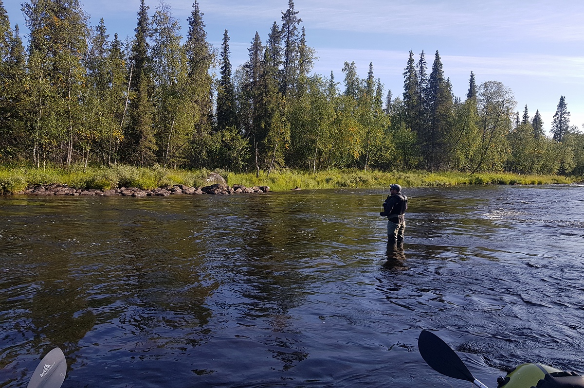 Die erste trockene Nacht seit fünf Tagen lag hinter uns und wir frühstückten Müsli in der Sonne am Fluss. Wir entschieden uns, unsere Sachen um die Rauschen herum zu tragen und danach wieder einzusteigen. Am Wasser fanden wir einen verlassenen Zeltplatz, der wohl öfters von anderen Paddlern oder Anglern benutzt wurde. Ich sah ein paar Fische am Steigen und musste dann doch nochmal schnell fischen. Sven machte es sich in der Sonne gemütlich, schoss ein paar Bilder und lachte mich aus, weil ich schon wieder Fische verlor. Am Ende blieben dennoch 3 schöne Äschen hängen. Irgendwie vermissten wir aber die Forellen. Die letzte Forelle die wir zu Gesicht bekommen hatten, war in dem anderem Gewässersystem an Tag 3!! |