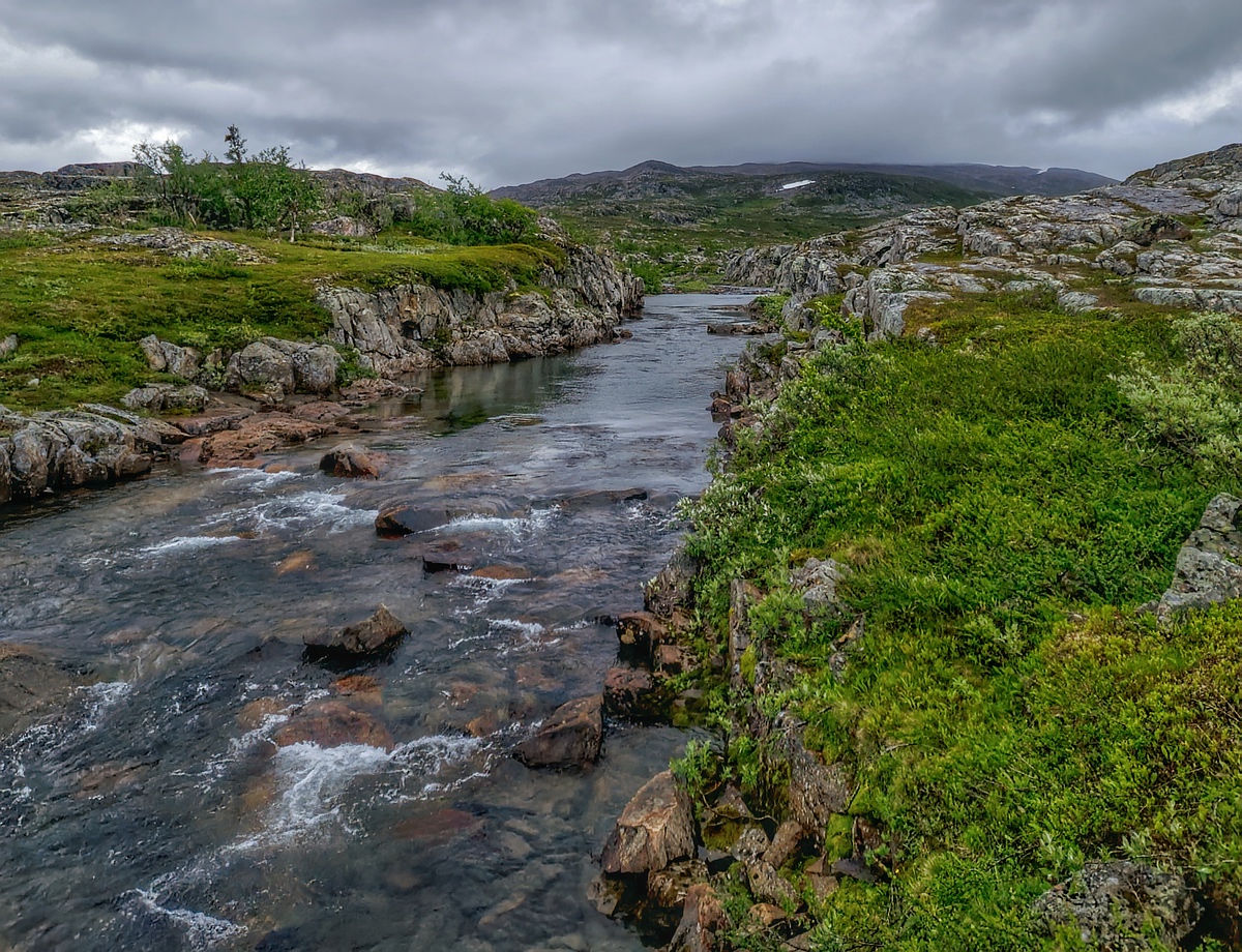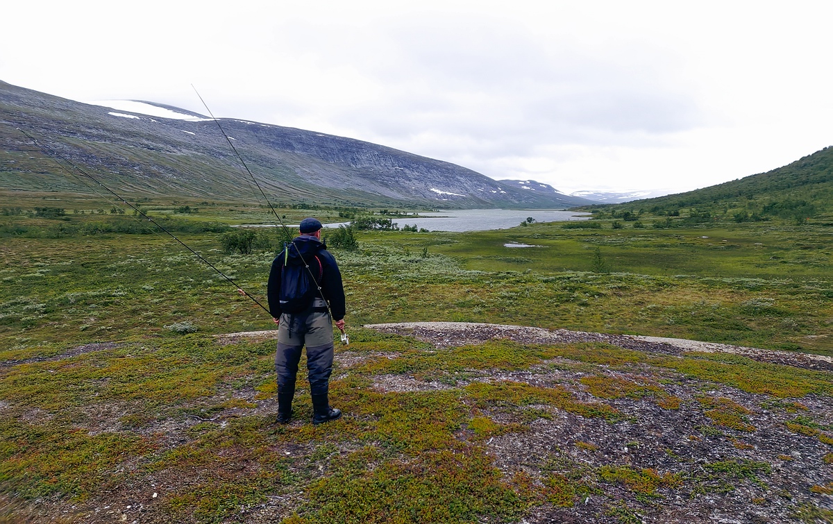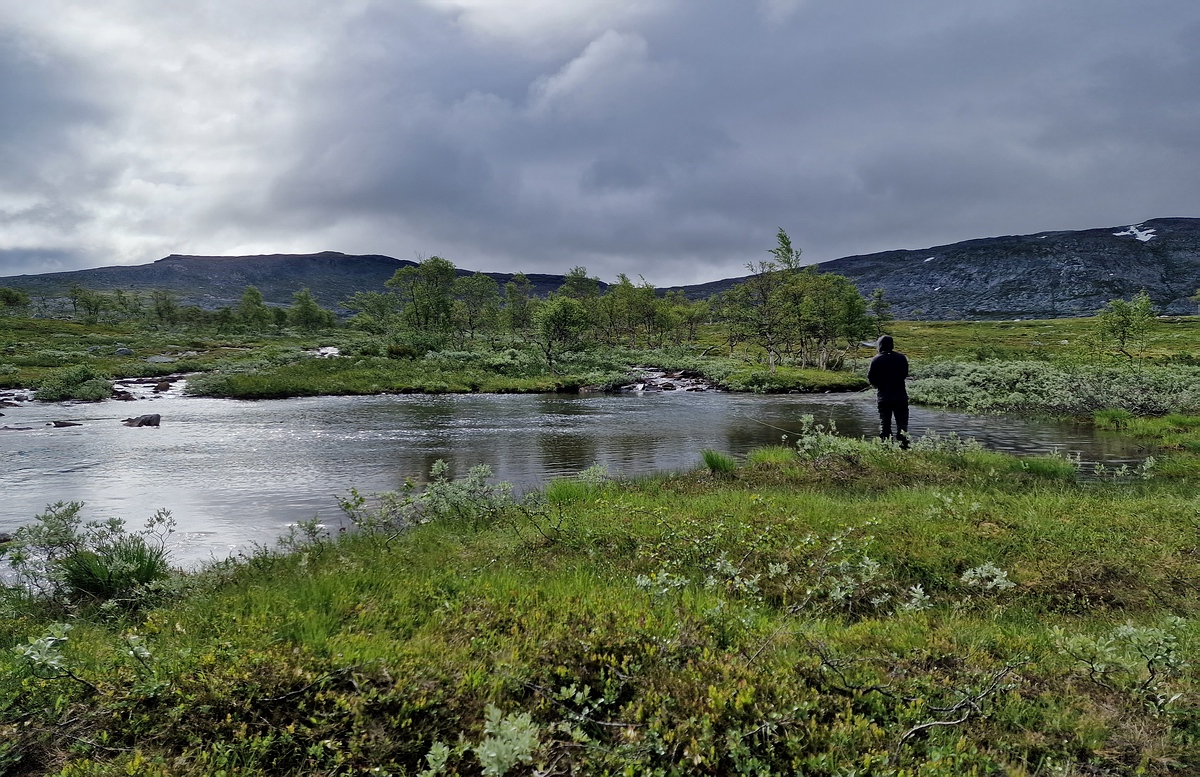 24.07. Morgens das erste Frühstück seit Beginn der Tour bei dem mein Magen nicht rebelliert. Ist auch gut so, denn es steht eine etwas längere Etappe an, knapp 10km und 200 Höhenmeter hoch und runter sollen es werden. Zunächst folgen wir dem Fluss aufwärts, überqueren die Wasserscheide und folgen dann einem anderen ziemlich ähnlich strukturierten Fluss abwärts. Der nächste Fluss unterscheidet sich allerdings in einem wichtigen Punkt, er entspringt aus einem See und mündet in einen anderen großen See. Demnach ist meiner Erfahrung nach die Chance auf einen guten Forellenbestand deutlich höher. Bereits beim Frühstück sind wir allerdings am Diskutieren ob wir an den See gehen aus dem der Fluss entspringt oder lieber noch 2km weiter an eine schön strukturierte Stelle des Flusses mit tiefen ruhigen Kurven. Aber von Anfang an, nach dem Frühstück und Abbau des Lagers, fällt uns auf, dass es absolut Windstill ist. Bei diesen Bedingungen möchte Nicki unbedingt nochmal an den See. Wir laufen die paar hundert Meter von unserem Camp zum kleinen Trampelpfad, legen unsere Rucksäcke ab und Nicki läuft alleine ein paar hundert Meter, bis er den See sehen kann, den wir gestern befischt haben. Der See ist tatsächlich spiegelglatt und er kann einiges an Fischaktivität ausmachen. Er kommt zurück, wir ziehen uns um und laufen in Watklamotten und mit montierter 5er Rute Richtung See. Leider kommt auf halbem Weg Wind auf und nachdem
