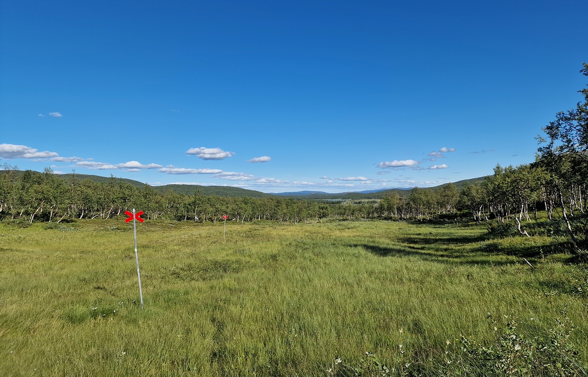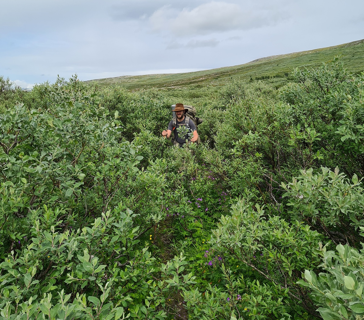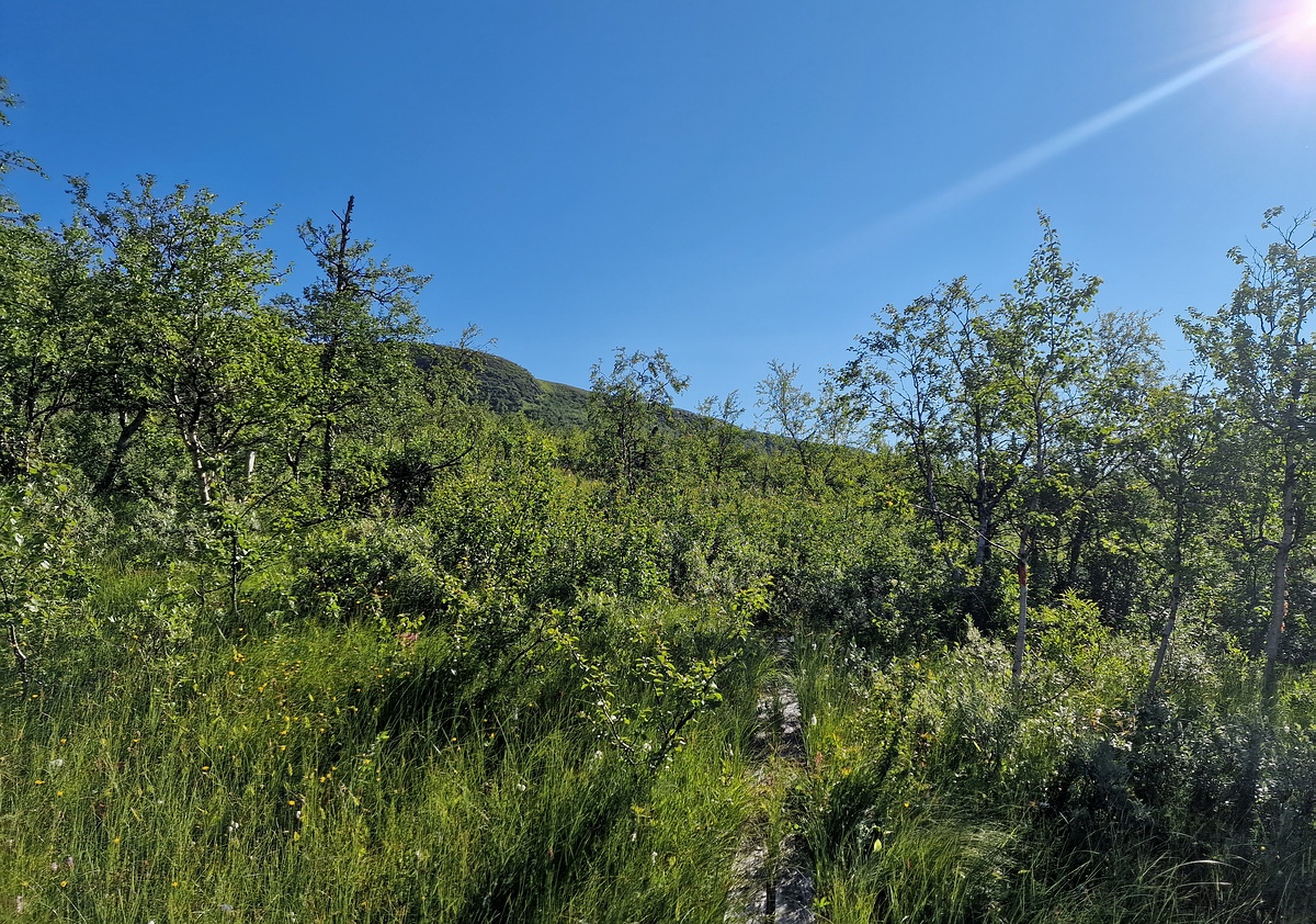 Bei der Hitze sind leider viele Blutsaugende Insekten unterwegs, neben den üblichen Mücken und Gnitzen werden wir auch noch von großen Bremsen attackiert. Zumindest unsere Erkundungsmission ist erfolgreich, der vermeintlich einfache Weg, eine Schneemobilpiste, ist durch hohes Gras und sehr weichen feuchten Boden recht beschwerlich zu laufen. 200m parallel verlaufend gibt es aber einen kleinen Trampelpfad durchs Gebüsch, der mit schwerem Rucksack deutlich einfacher zu begehen sein wird. |
