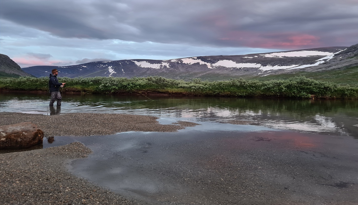 Gegen 20:30 Uhr sind wir wieder am Platz. Der Fluss liegt spiegelglatt vor uns und die Fischaktivität nimmt mit jeder Minute zu. Zuerst fische ich wieder mit der Foam Caddis und kann damit eine Mitte 30er landen. Dann bemerke ich aber immer mehr Caddies Pupas, die an der Oberfläche schwimmen und dabei ein kleines V an der Oberfläche erzeugen. Die Forellen scheinen sich darauf einzustellen und ignorieren mein Muster, zum Glück habe ich aber etwas Passendes dabei und das leichte Furchen lässt sich einfach imitieren. Mit dieser Technik erwische ich noch 3 weitere Forellen, eine davon über 40cm. So einen guten insektenschlupf wie diesen Abend hatten wir so weit im Norden selten (mal abgesehen von den Bibios im Vorjahr aber da waren wir einige hundert Höhenmeter niedriger). Gegen 22:30 Uhr verschwindet die Sonne komplett