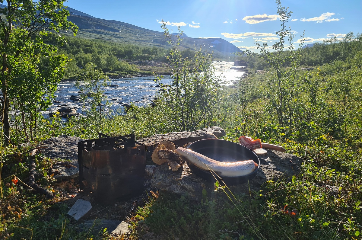 | Zurück am Camp ziehen wir das Abendessen auf 19:00 Uhr vor. Es gibt Kartoffelpüree mit Speck, frischen Pilzen und dazu gebratene Forelle. |
