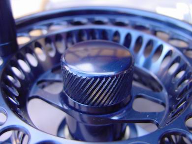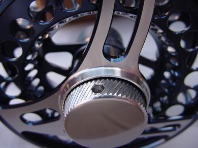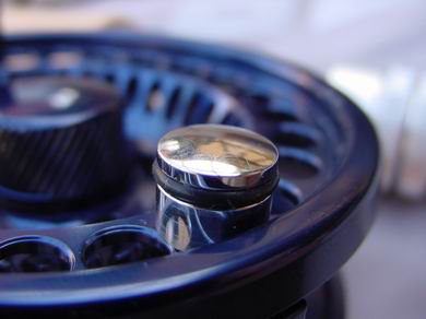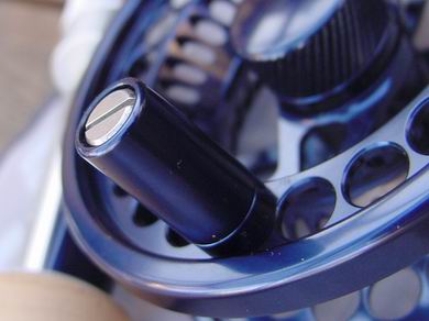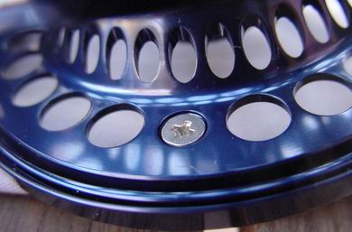 Die Opti Creek ist ein wahres Schmuckstück, sie hat jedoch neben den optischen auch technisch sehr hohe Qualitäten. Es handelt sich um eine laut Herstellerangabe komplett salzwasserfeste Großkern-Fliegenrolle, gefräst und gedreht aus einem Block hochwertigem C70 Flugzeugaluminium. Die Rollenoberfläche wurde in königsblau, mit leicht metallischem Glanz, eloxiert. Der Spulenkern ist bis auf zwei Verbindungsstege offen. Der zur optimaleren Schnuraufrollung und für höhere Kapazität V-förmige gestaltete Spulenboden wurde durchgehend gelocht, ebenso wie die Spulenvorder- und Rückseite. Die ansonsten ganz offene Gehäuserückseite ziert einzig ein stilistisches, großes, silbernes "L", in dessen Mitte befindet der griffige Bremseinstell-Knopf. Die Spule mit übergreifendem Rand läuft auf einer Edelstahlachse im geschlossenen Rollenrahmen, unter guter gehäuseseitiger Platzausnutzung. Das Lauf- und Bremssystem wurde vollkommen wasserdicht und verkapselt untergebracht. Der Rollenfuß wurde zweifach von Außen geschraubt. Ein breiter Steg hinten hält den Rollenfuß, ein schmalerer Steg vorne mittig dient der Schnurführung. Daneben gibt es jeweils links und rechts davon, um 4,5cm versetzt, zwei weitere, schmale Stege. Bei der geschlossenen Rahmenbauweise ist das Risiko eines ungewollten "Durchflutschen" von Vorfach und Schnur nicht gegeben. Auf der Spulenvorderseite sitzt eine dazu passende Aluminium-Kurbel, die präzise und ohne Spiel arbeitet, ihr gegenüber befindet sich ein Kontergewicht, welches ganz clever einen Klemmring zur Fixierung der Vorfachspitze enthält. |