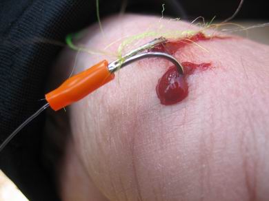 Je nach Loch und Strömung war sogar 4/5 vorteilhaft! Wir haben meistens ein Extra Super Fast, oder Super Fast Polyleader in der Länge von 10 ft. vorgeschaltet! Um einen sich schon lange im Fluss befindenden Fisch zu fangen, muss man eben runter… Das Fischen mit den schweren Leinen war für die meisten von uns eine Riesenumstellung und kein Kinderspiel, aber nach einigen Tagen gewöhnt man sich auch daran. Als Vorfach diente Mono der Stärken 0,40 er oder 0,45 er. Das stört keinen Fisch, ist aber zwingend notwendig, wegen der vielen Steine im Fluss, während des Drills! |