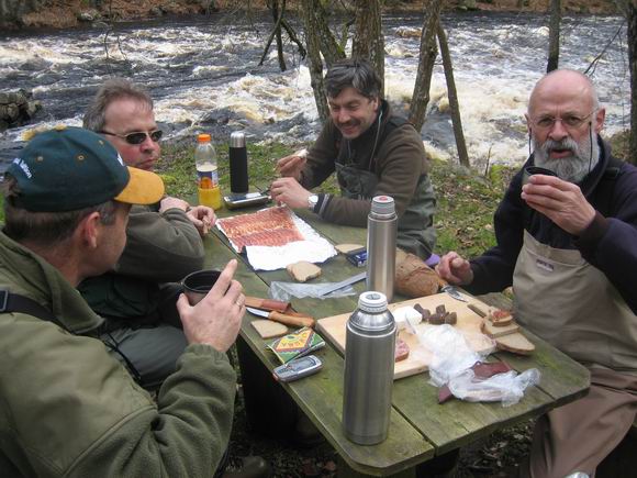 Thomas fing am gleichen Tag auch seinen 1. Lachs mit seiner selbstgebauten gespliessten Zweihandrute (92 cm) und verlor kurz darauf den zweiten Fisch. An diesem Abend, wen wundert`s, gab es natürlich Party, Rotwein und so weiter … der Rest des Abends unterliegt der Zensur und wird evtl. im persönlichen Gespräch preisgegeben! |