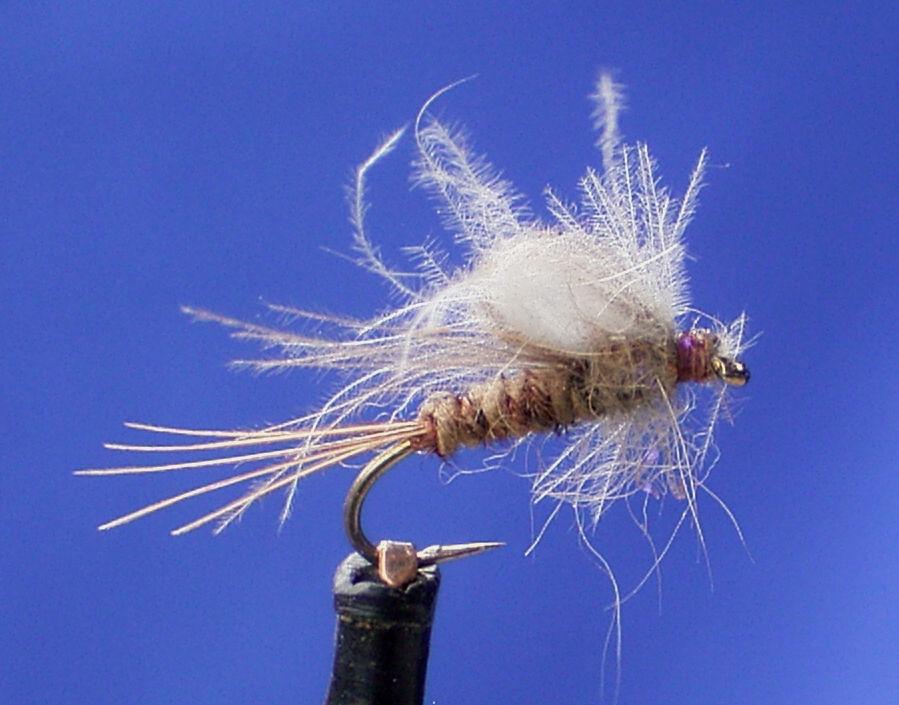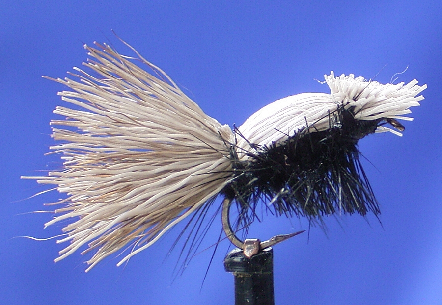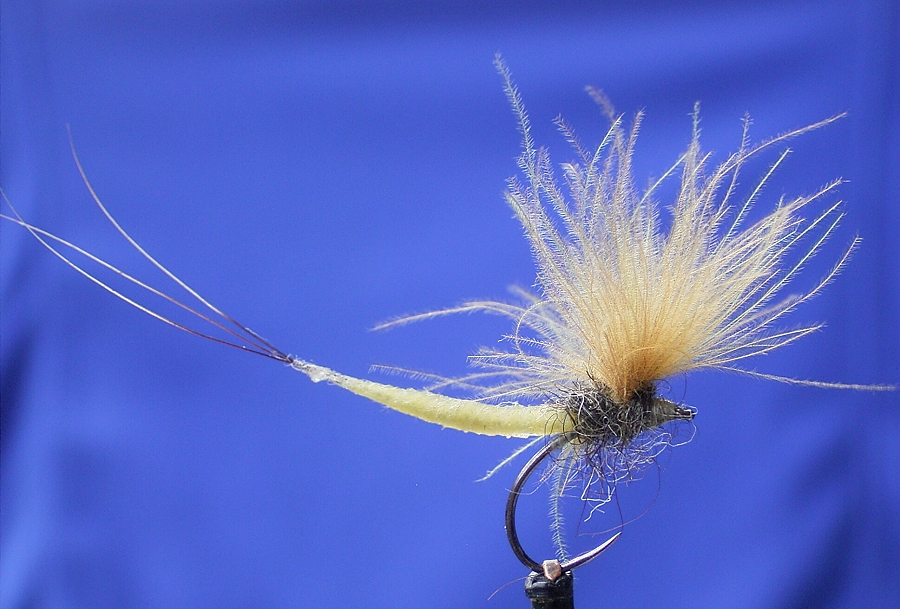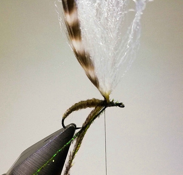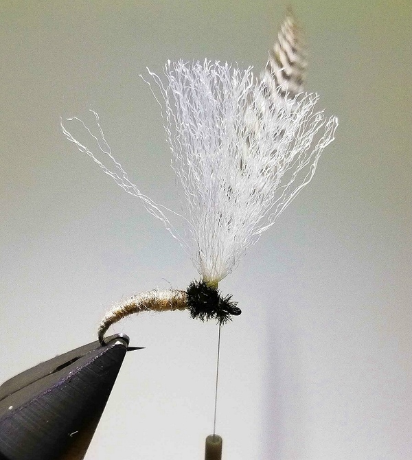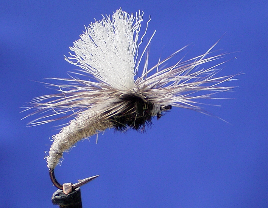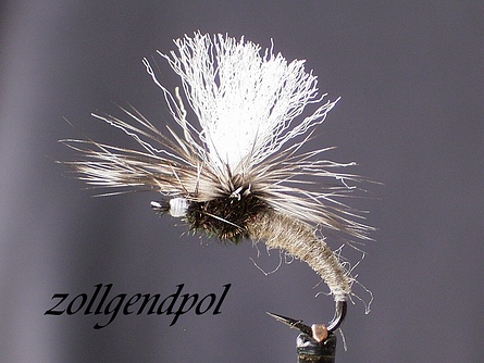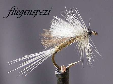 Haken: VMC Größe 12 Körper: Antrondubbing olive Schwanz: Coq de leon Flügel: Unterflügel CDC grau Oberflügel CDC weiß Hechel: blue dun Faden: 8/0 schwarz Bindeanleitung