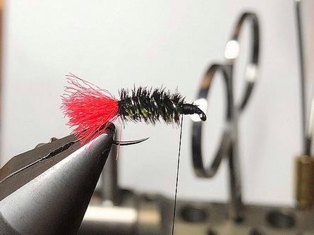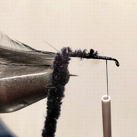 Haken: Mustard 94833 Dry Gr.12 Bindefaden: Uni 6/0 schwarz Körpermaterial: Chenille schwarz Rücken und Schwänzchen: Rehhaar Beinchen: Hahnenhechel schwarz - Micro Barb Bindeanleitung