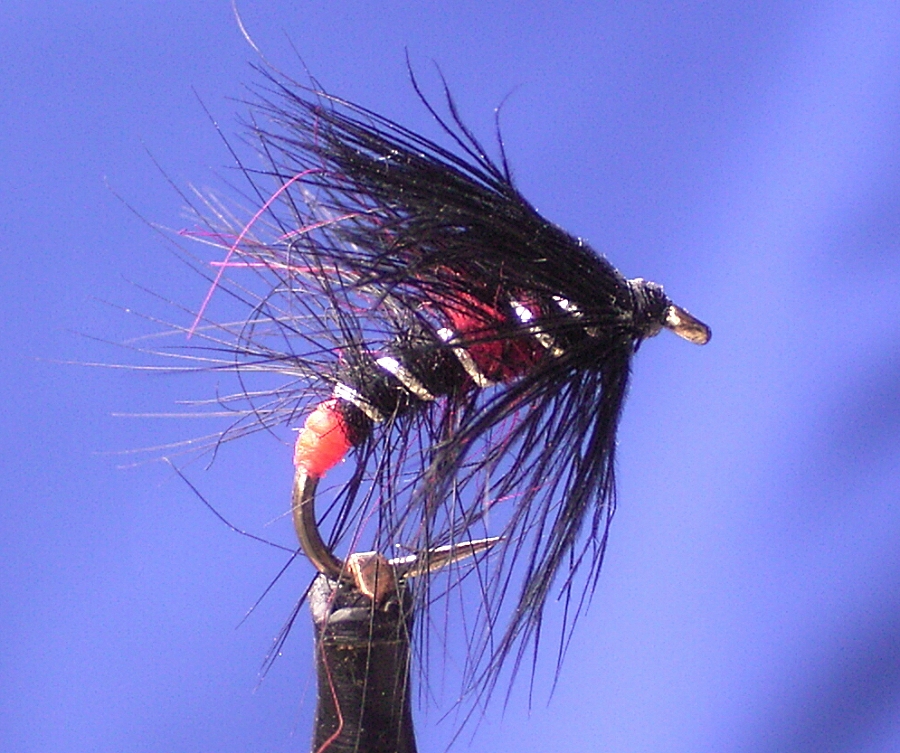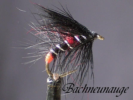 Haken: Nassfliegenhaken Gr. 8-14 Faden: Uni 8/0 schwarz Tag: Unistretch Chinese red Rippung: Ovaltinsel silber small Körper: Sealsfur in rot und schwarz Körperhechel: Hahn schwarz Kopfhechel: Henne schwarz |