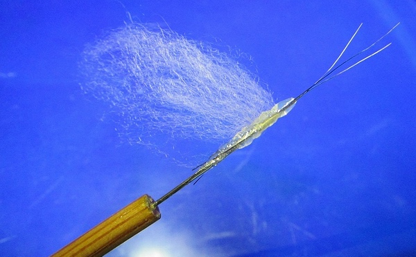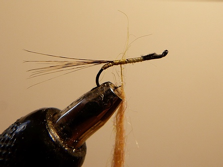 Den hinteren Überstand der Fiebern abschneiden und mit dem rauhen Dubbing den Thorax formen. Zum Schluss noch einen Abschlussknoten und einen