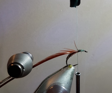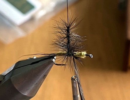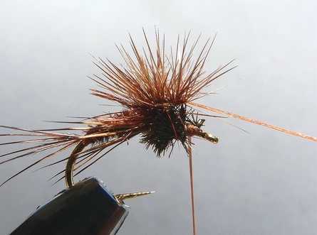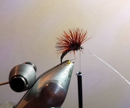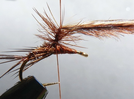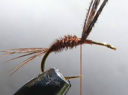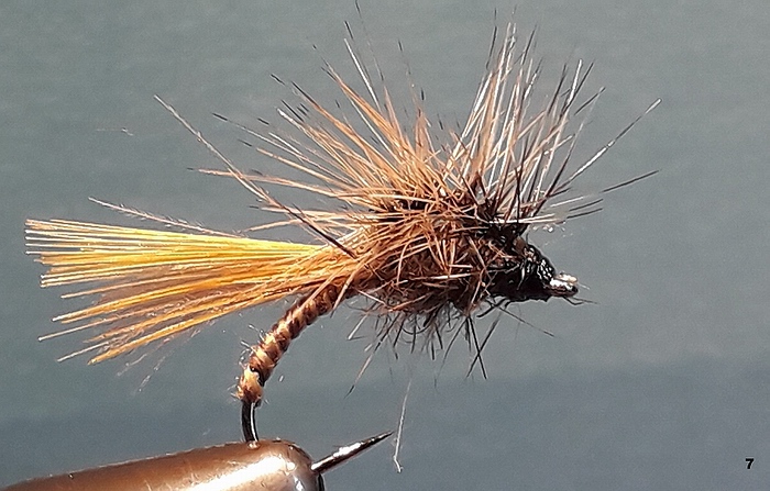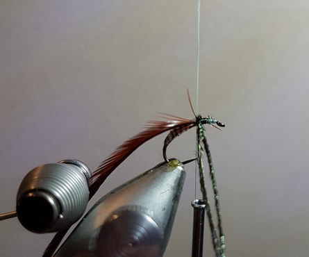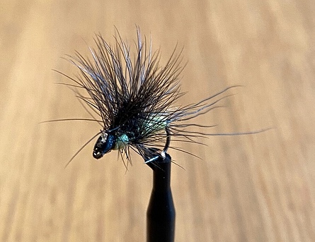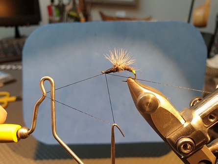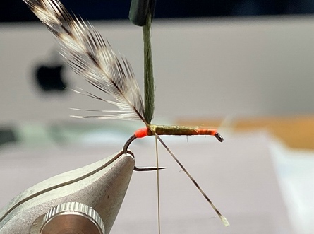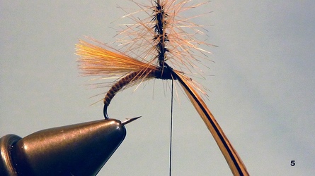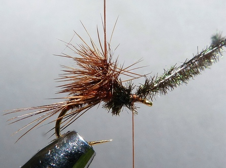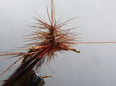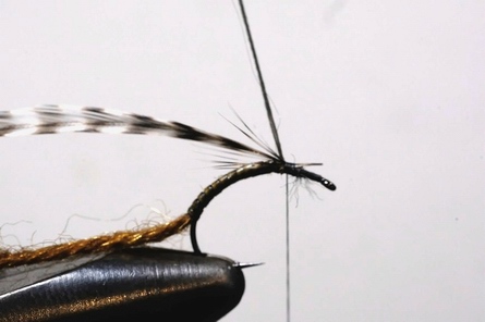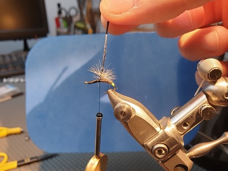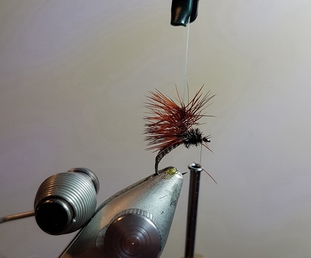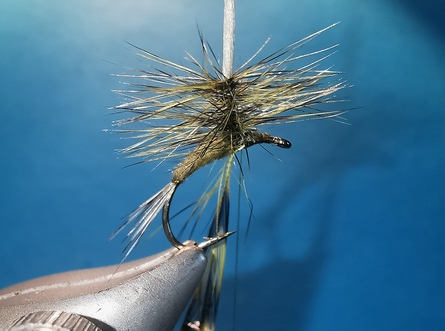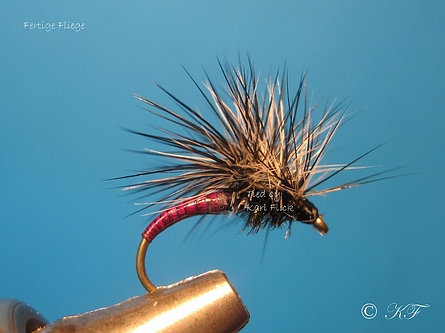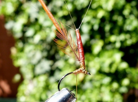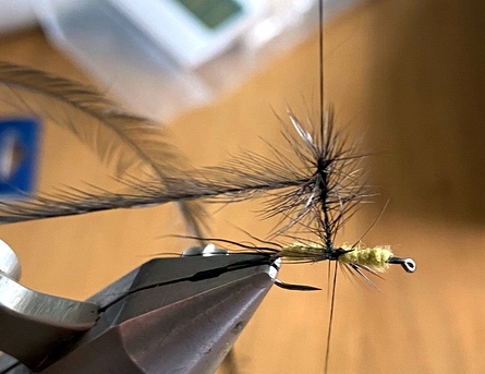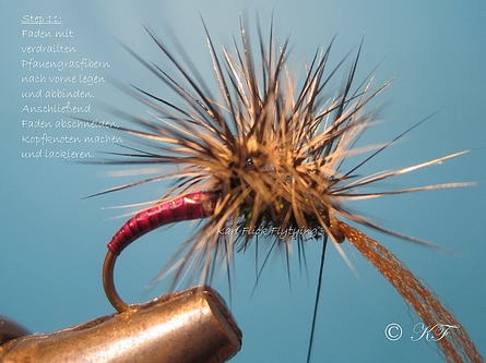 Die zurück gestreiften Hecheln über den Thorax legen und das Polyyarn abbinden. Das Polyyarn nach dem Abbinden abschneiden und einen Kopfknoten formen und die Fliege damit abschließen. Danach noch einen Tropfen Lack auf den Kopfknoten zum Festigen. |