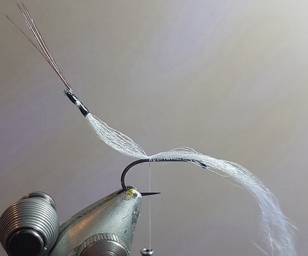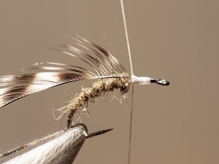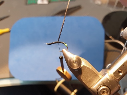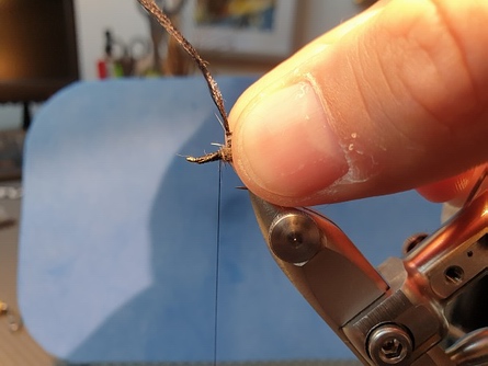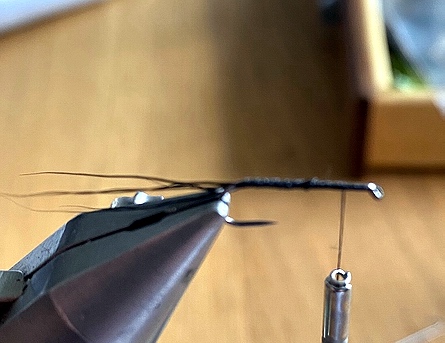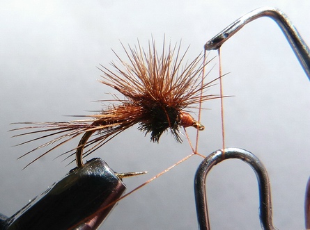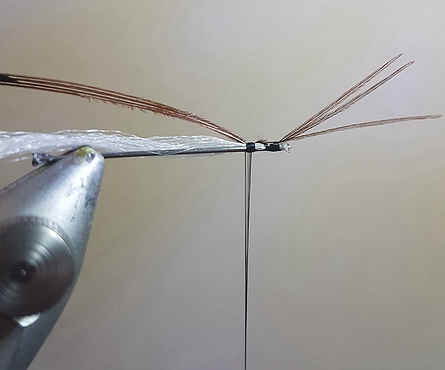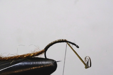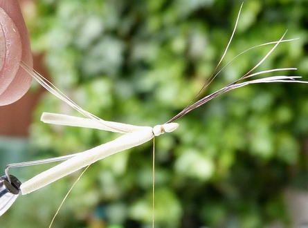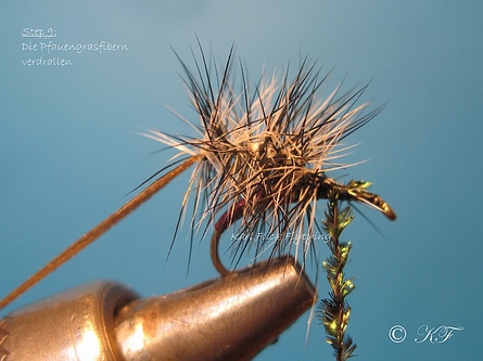 führen (Länge bis ca. 2mm vor dem Hakenöhr) und anschließend nach unten verdichten und abbinden (hier hilft es, mit einer Hechelklemme die Fibern an der Abbindestelle vor dem Abbinden zu entfernen). |