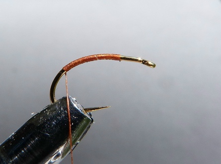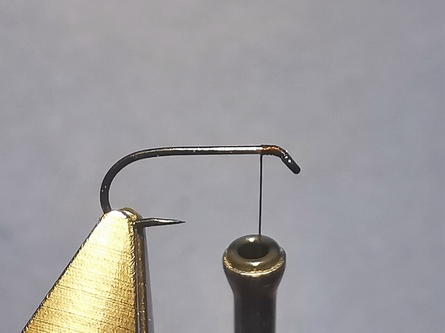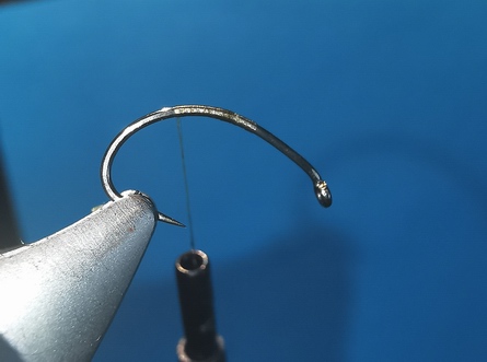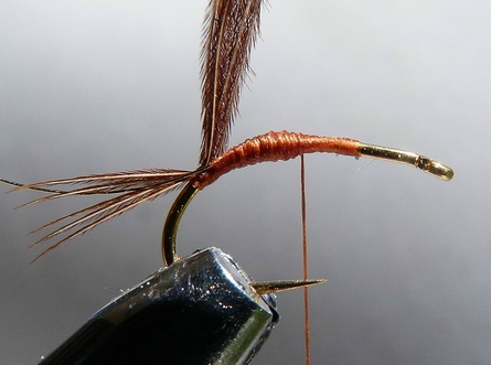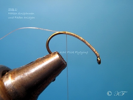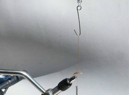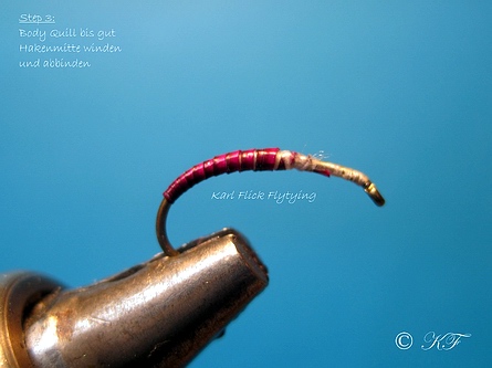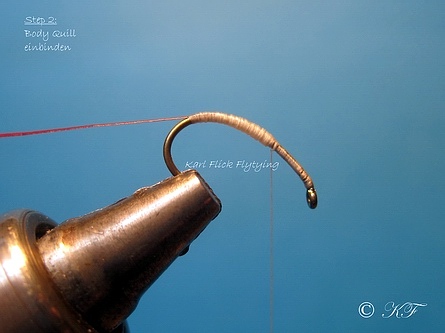 schlanken Körper entwickeln und 2mm vor dem Hakenöhr abbinden. Halben Schlag zur Sicherung des Bindefadens setzen. |