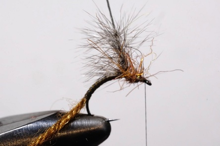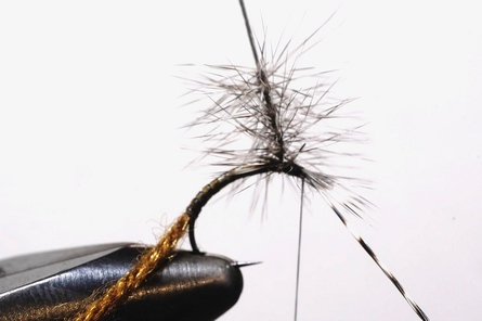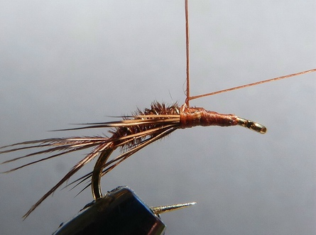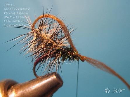 Thorax bilden. Die Hechel nach hinten streifen, damit der Thorax sauber geformt werden kann und keine Hechelspitze eingebunden wird. |