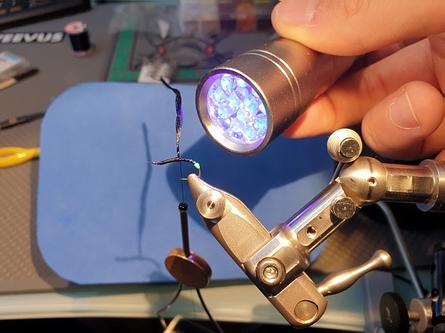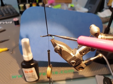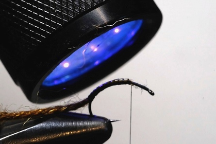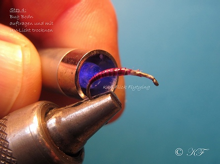 | Die ersten 5mm des Stiels werden mit BugBond | bestrichen und mit der UV Lampe gehärtet. |