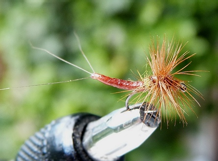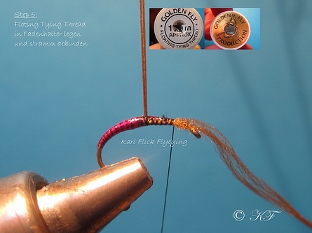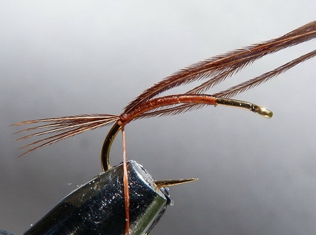 Haken: # 14 Bindefaden: braun Körper: Bodyquill rot gefärbt Post: Golden Fly Floating Tying Thread Flügel: 2 Sattelfedern hell & dunkel Thorax: 2 Fibern aus dem Pfauenauge/Pfaugras Sonstiges: Bug Bond Coating & Lampe Bindeanleitung: |