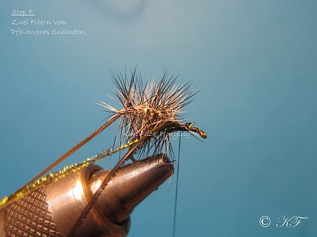 - Scudhaken (z.B. von Fliegentom) - Uni-Thread 8/0 weiß - Nanosilk 18/0 grün - Pfauen-Quill - braune Hechel - Pfauengras - UV-Lack Bindenanleitung: |