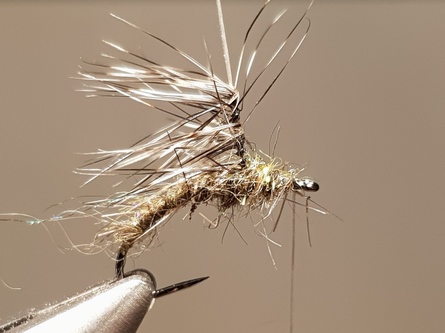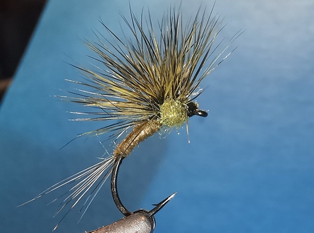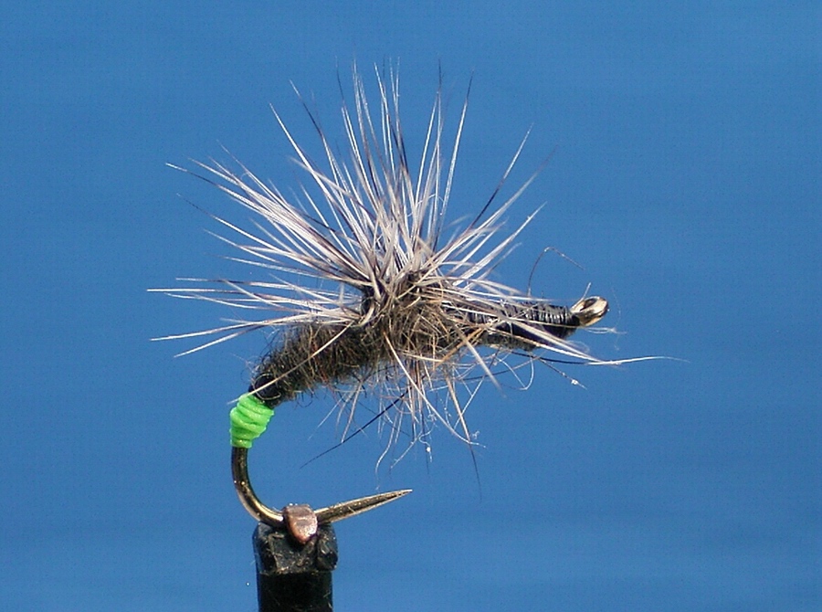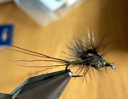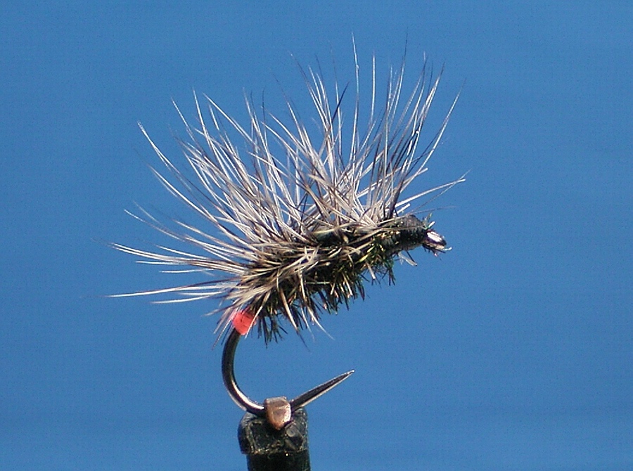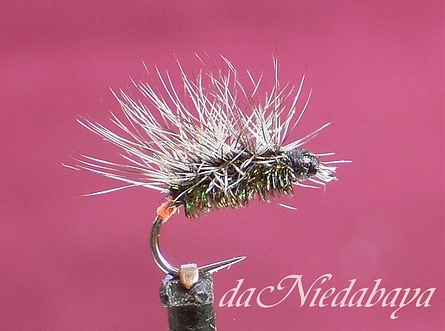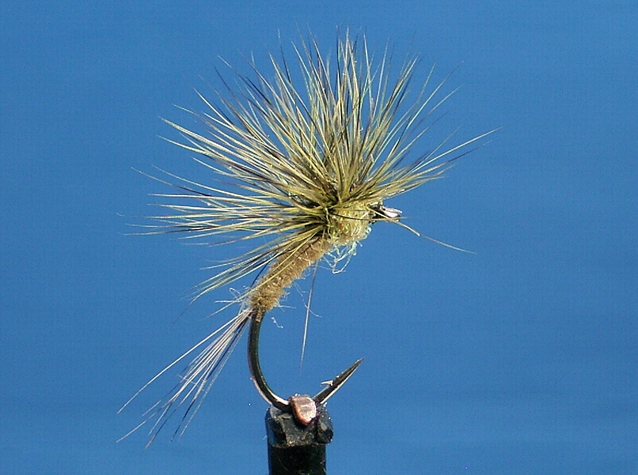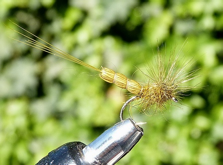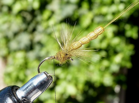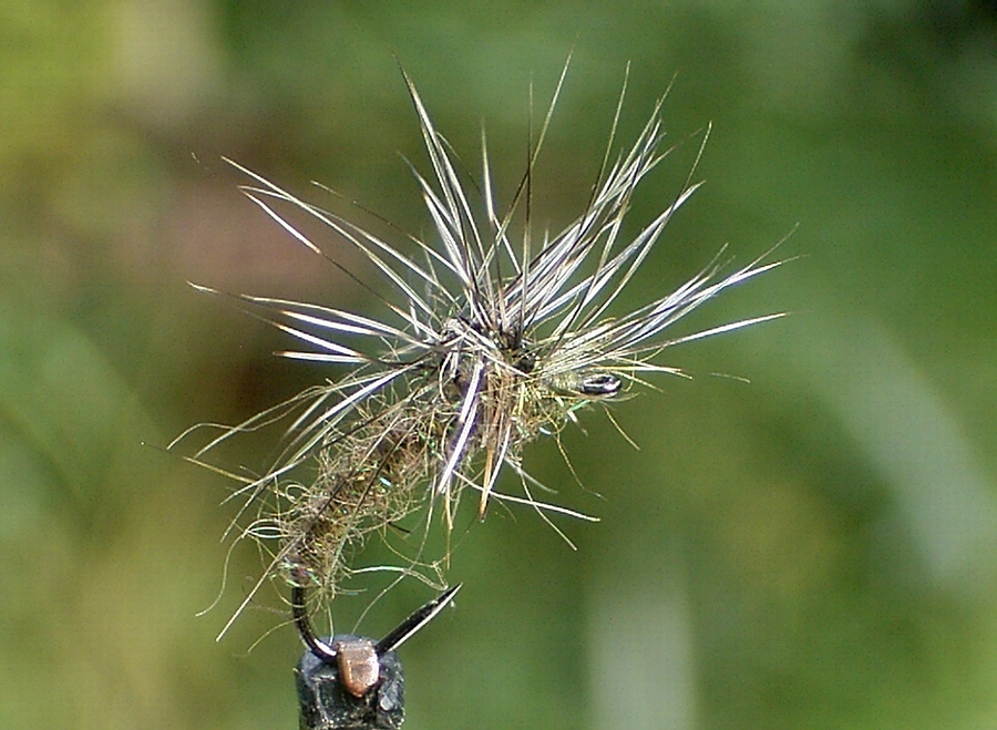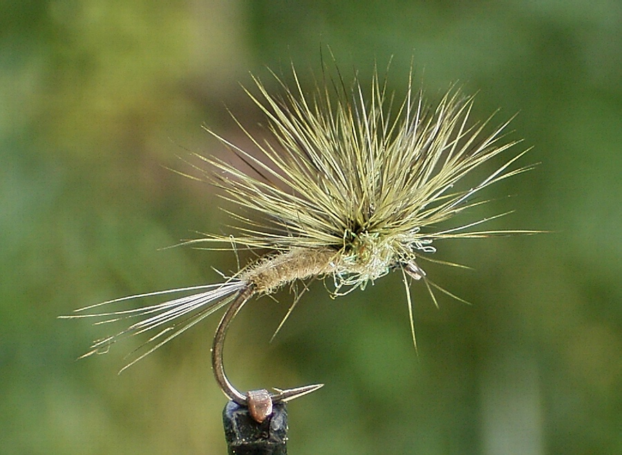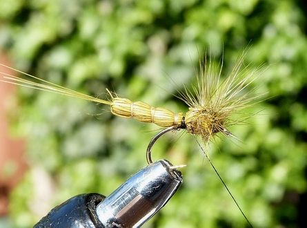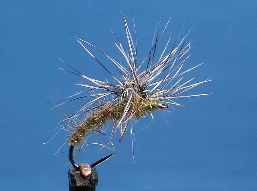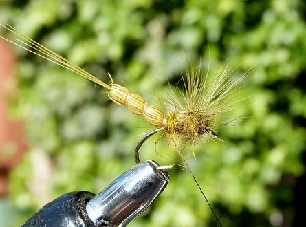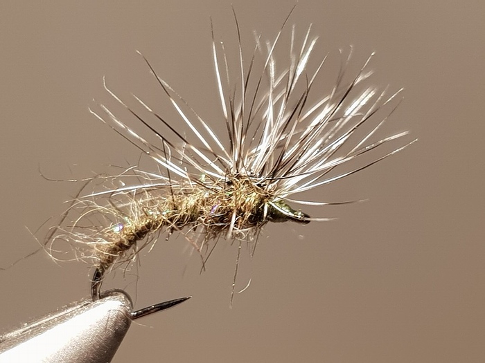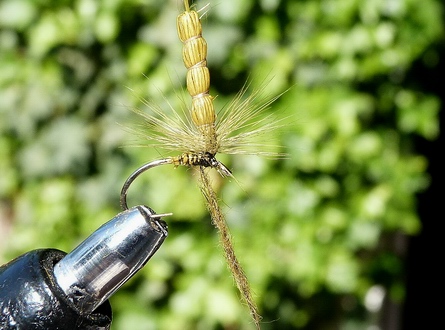 Haken: Kamasan B 100 # 14 Bindefaden: Ultra Thread 70 olive Schwänzchen: 4 – 6 Grannen vom Dachs ExBody: J:son Foam 2mm tan (?) Abdomen: Argentinian Hare 06 olive Thorax: Mad Rabbit Dubbing olive Flügel: Whiting rooster saddle pack grizzly olive Sonstiges: MK Wachs, feine Nadel oder J:son ExBody Tool |