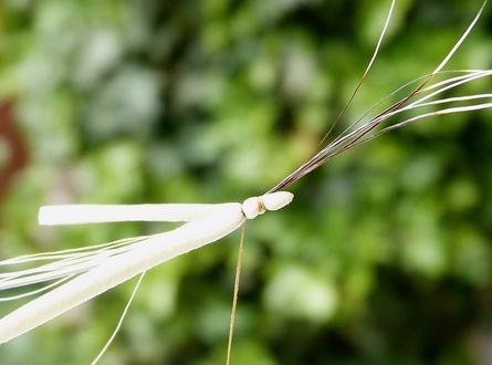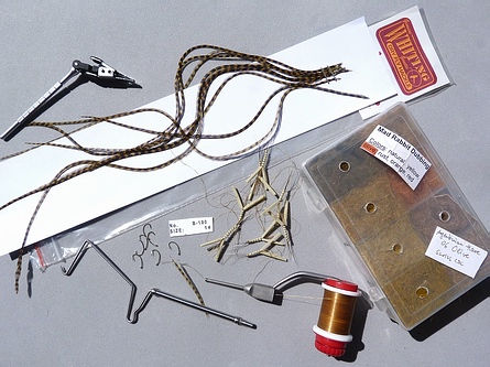 - Trockenfliegenhaken (z.B. von Fliegentom) - Uni-Thread 8/0 weiß - Nanosilk 18/0 grün - Poly-Wing - Fasanenstoßfeder - Straußenfeder beige - Grizzly-Hechel Bindeanleitung: |