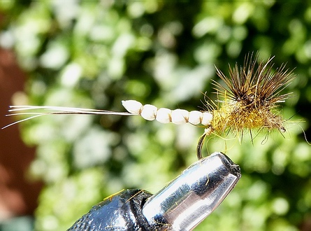 – ganz einfach ist Chenille oder Foam (kurz die Spitze mit einem Feuerzeug erhitzen und in den Fingern rollen) – man kann aber auch aufwändige Körper mit Schwänzchen z.B. aus Rehhaar oder Vinyl herstellen … Mit der Bonus-Fliege bin ich noch nicht so ganz glücklich, aber mir fehlte die Zeit, da erstmal 20 bis 30 Testfliegen zu binden – ich wollte Euch aber unbedingt diese Bindeweise vorstellen. |