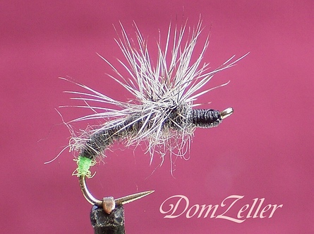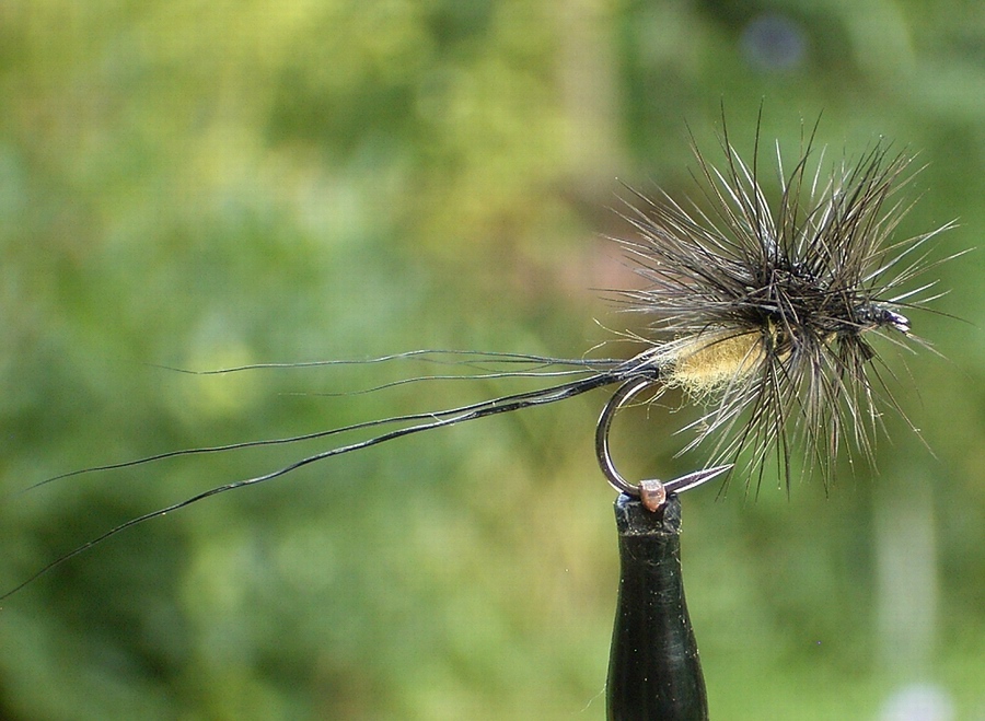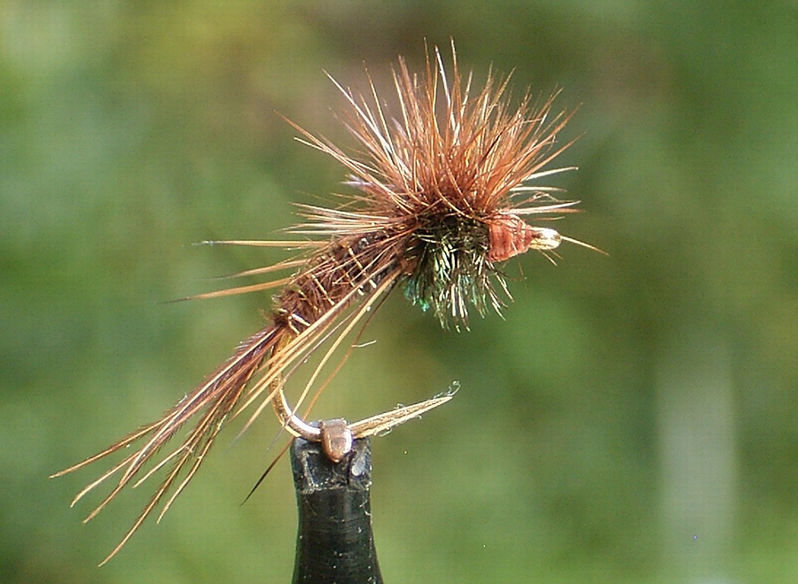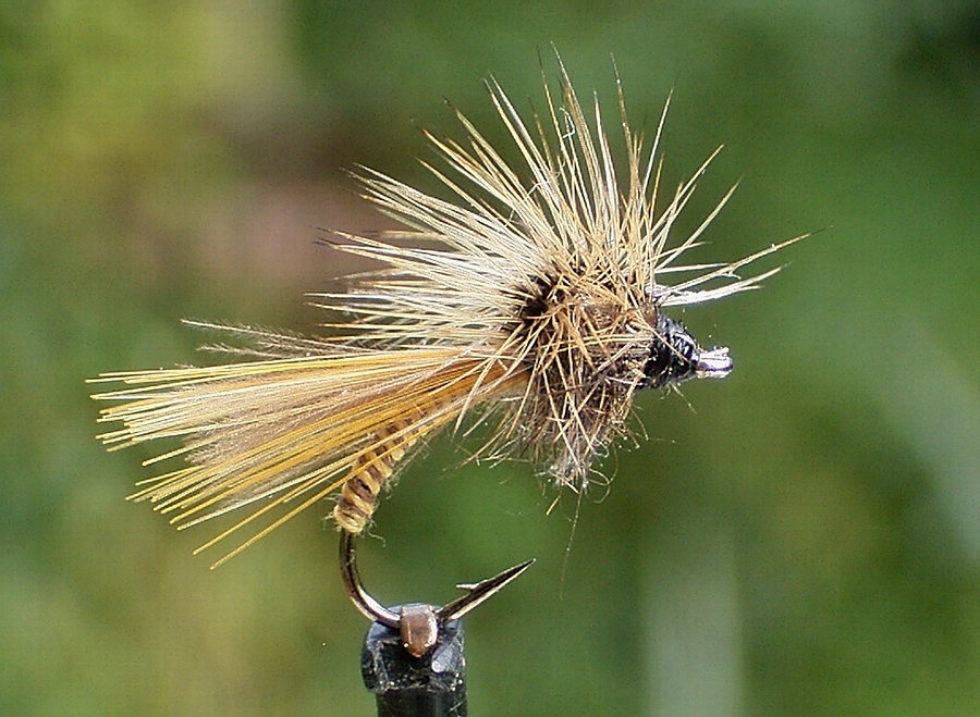 Haken: Tiemco 212Y - GR 11 Bindfaden: Sheer 14/0 schwarz Schwanz: Wolle braun (ZM Master) Körper: Pfauenquill olive (selbst gefärbt) Lack: UV Lack Hechel: Grizzly Thorax: Dubbing (Magic Dubbing) Bindeanleitung: |