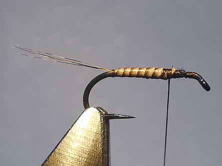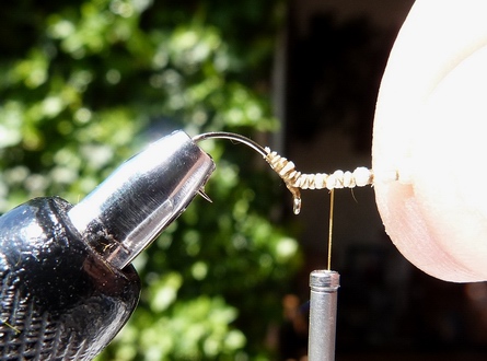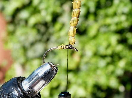 erreicht ist. Abschlußknoten und den Bindefaden mit ein paar Zentimeter Überstand abschneiden. Vorsichtig unter leichtem Zug und Drehung den Body von der Nadel ziehen. |
