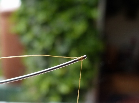 vorn am Nadelöhr fixieren, strammziehen und mit 2
