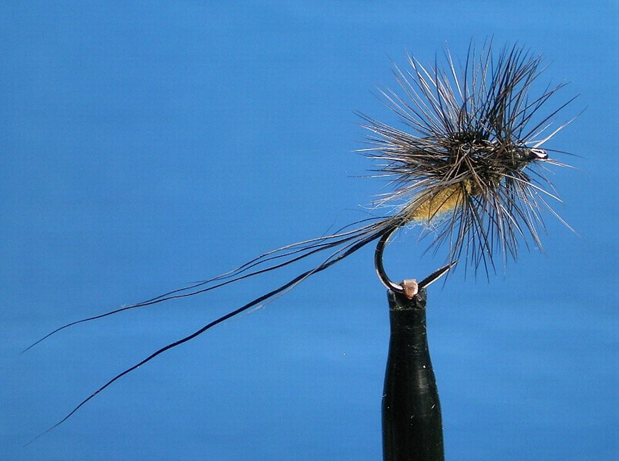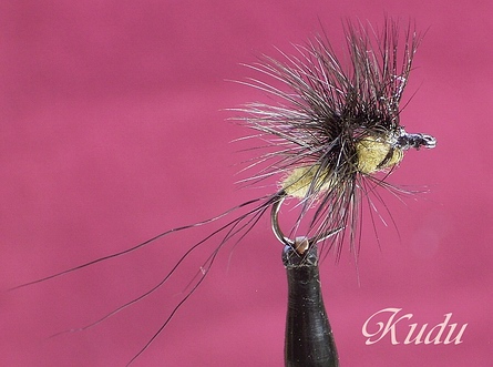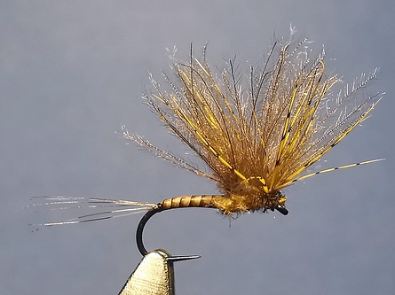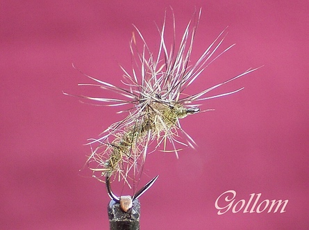 Bindefaden: Semperfli Nano Silk 18/0 Haken: Kamasan B100 bronze #14 Schwanz: Coq de Leon Körper: Kapok olive Thorax: Ice Dubbing gelb Hechel: Hahn olive/grizzly Hechelstütze: Polyyarn weiß Bindeanleitung: |