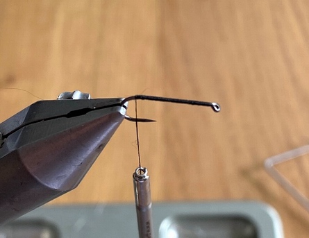 diesem Fall das J:son Tool) und ganz an der Spitze den Bindefaden festlegen. Das Fadenende sollte mind. 5 cm lang sein |