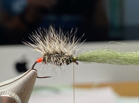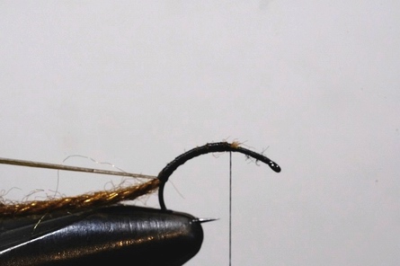 | Den Faden wachsen und das Dubbing anspinnen und den Thorax gestalten. | Das Floss am Öhr festlegen. |