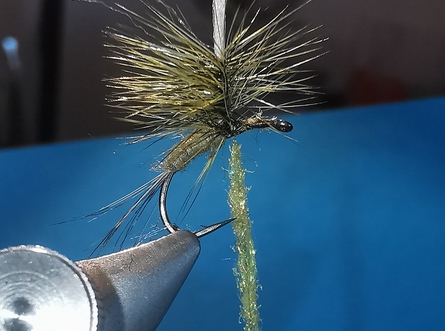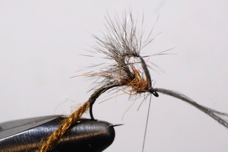 | 1. Körper Dubben und den Körper leicht ausbürsten | 2. Die halb gestrippte Hechel einbinden |