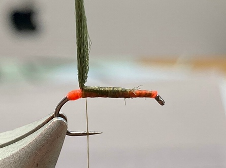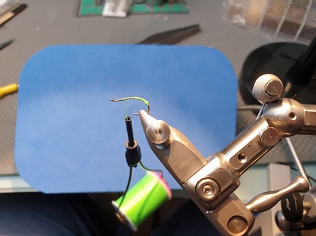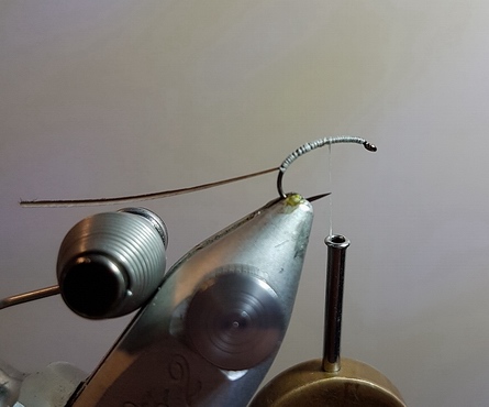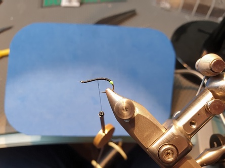 eine Grundwicklung legen und am Hakenbogen einen Reizpunkt setzen. Faden nach vorne führen und nach einem Halbschlag abschneiden. Neue Grundwicklung mit UTC 70 Olive bis zur Mitte des Hakens führen. |