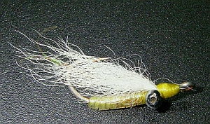Hakengröße 4 – 8 Bindefaden: gelb Augen: Kettchenaugen Körper: Unterkörper gelbes Lureflash überwickelt mit klarem Bodyglass Schwinge: Kalbschwanz weiß, etwas Crystal Flash Sehr fängig auf hellem Untergrund. |