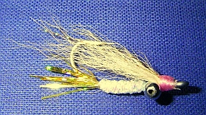 Hakengröße: 2 – 6 | Bindefaden: tan | Augen: Bleiaugen schwarz mit roter Pupille | Körper: kein Körper. | Schwinge: Bucktail weiß und tan, etwas Crystal Flash. Der Clouser Minnow, als wohl vielseitigste und beste Salzwasserfliege überhaupt, ist auch eine hervorragende Bonefischfliege. Weitere fängige Farbkombinationen: chartreuse/weiß, olive/weiß, pink/weiß. |