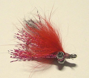 Hakengröße 4 – 6 | Bindefaden: rot | Augen: Kettchenaugen Körper: rotes Crystal Flash überwickelt mit klarem Bodyglass Schwinge: Kaninchen rot und weiß, rotes Crystal Flash Normalerweise sollten Bonefischfliegen der Farbe des Untergrunds angepasst sein. Es gibt aber Ausnahmen. An Tagen mit schlechtem Licht (Wolken, morgens, abends) oder auf muddende Bones (Fische, die bei der Nahrungssuche große Schlammwolken erzeugen) werden Reizfliegen gefischt, da diese von den Fischen besser wahrgenommen werden. Hier werden dann bunte Fliegen (rot, orange, leuchtgrün etc.) gefischt. Bei klarem Wasser sollten Sie solche Fliegen nicht verwenden; sie entwickeln dann eine Scheuchwirkung! |