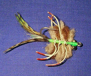 Hakengröße 4 – 8 Bindefaden: braun Augen: Kettchenaugen rot mit schwarzer Pupille Körper: Unterkörper goldenes Flashabou überwickelt mit klarem Bodyglass. Schwinge: Polarfuchs braun, etwas goldenes Crystal Flash. Eine Fliege für dunklen Untergrund. |