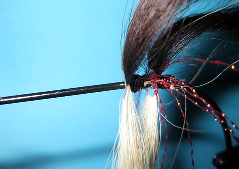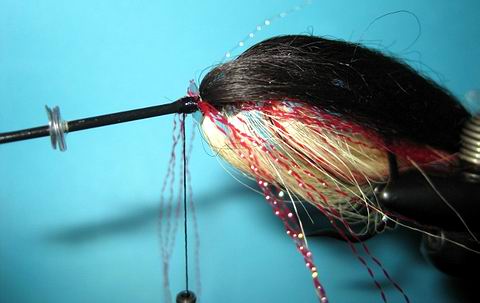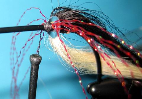Hinter der Pailette wird der Bindefaden neu angewunden und 4-6 Fäden rotes Krystal Hair waagerecht eingebunden. |