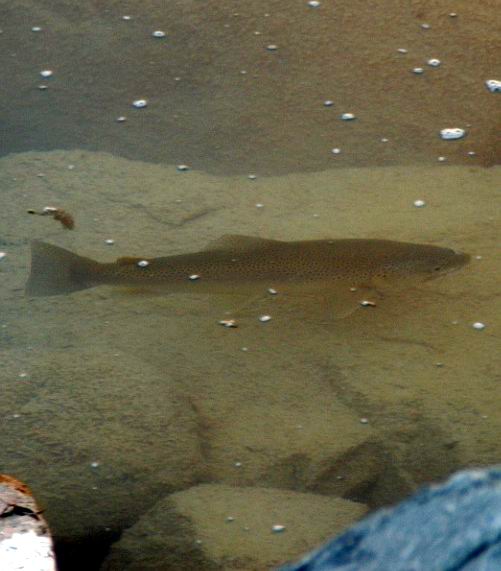 | Das Spiel beginnt von vorne, ich werfe meine Fliege öfters schlecht als recht Richtung Seemitte und ziehe die Nymphe herein, die Landschaft ununterbrochen aufsaugend ob der Schönheit. Gedankenverloren habe ich den gelben Indikator im Augenwinkel, wieder beginnt das Spiel von vorne: plötzliches Abtauchen der Schwimmhilfe und reflexartiges Anheben der Rutenspitze, die gehakte Forelle will sich vom fremden stechenden Ding befreien, springt und schüttelt sich in der Luft gefolgt von einer weiten Flucht. Auch diesmal sitzt der Haken der Nymphe sicher und ich kann sie nach einigen Fluchtversuchen ins Landungsnetz führen. Diesmal ist es eine Bachforelle von knapp unter 50cm, die meine Nymphe nahm. Mehrmals an diesem Tag wiederholt sich dieses Schauspiel. Insgesamt 4 Regenbogenforellen und 2 Bachforellen, alle zwischen 45 und 57 cm lang, werden Opfer meiner Selbstgebundenen, zwei weitere Fische bleiben Sieger und kommen im Drill ab. |