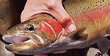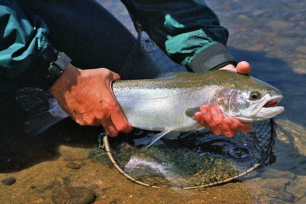 Etwas flussabwärts watete ich sanft am Ufer ein und konnte in der Flussmitte hinter einer größeren Steinformation eine Gruppe von 5 Fischen "spotten". Die Fische standen etwa auf einer Wassertiefe von etwa 1,4 Meter. Meine Fliegenwahl fiel auf eine helle mittelschwere Steinfliegennymphe auf 8er Haken. Nach zwei, drei Durchgängen kam die Nymphe immer näher an die ganz Außen stehende Forelle heran. Dann blieb der Bissanzeiger stehen. Eine schöne Rainbow! Nach dem Fang gönnte ich mir und den Fischen eine Pause. Was mir noch fehlte war, ein Erfolg mit der Trockenfliege, jedoch stiegen die Fische äußerst selten. Zwei trockene Muster brachten keinen Fisch an die Oberfläche. Danach präsentierte ich eine Eintagsfliegenimitation, mit Schwanzfibern aus Coq de Leon, den Körper segmentiert mit abgeriebenem Pfauenkiel, einer braunen Hahnenhechel, und gespreizten Flügeln vom Mallard. Nach zwei Durchläufen verbesserte ich die Lage der Fliege im Film in dem ich den Hechelkranz noch etwas stutzte. |