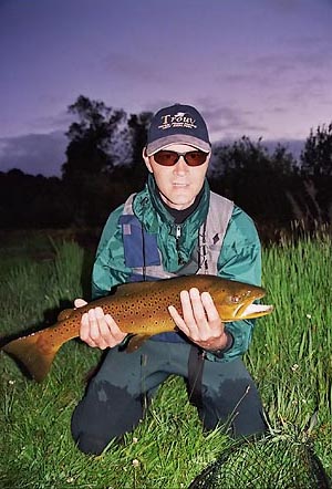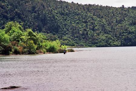 Einige Seen säumen die Route entlang der Westküste nach Norden. In jedem Infozentrum, ist der Ort auch noch so klein, gibt es Prospekte und Infos der umliegenden Seen und Flüsse, von den Guides der Region, mit Lodges und Forellen. Wer hier nicht mehr weiterkommt, dem kann geholfen werden. Gegen Abend fuhren wir am Lake Mapourika vom Highway 6 ab, und fanden einen guten Stellplatz mit Seeblick. Um an das Wasser zu gelangen, mußte ich eine steile Böschung von ca. 15 Metern absteigen. Am Wasser angekommen, kam erst einmal die Ernüchterung. Im Wasser lag starkes Geäst, das Ufer war überhängend und verwachsen, wurftechnisch waren nur Rollwürfe möglich. Die Sandflies rochen Menschenfleisch. Am Camper präparierte ich mich mit Insektenmittel im Gesicht, an Ohren und Händen, griff die Rute und stieg die Böschung hinab. Leicht auflandiger Wind, Abendstimmung, einsam brachte ich einige Rollwürfe heraus. Meine Fliege ein Fellstreamer mit grünem Chenillekörper ließ sich gut werfen und sah blendend im Wasser aus. Fast drei Minuten ließ ich das Fellbündchen absinken, um es dann mit kurzen sehr scharfen Zügen ranzuziehen. Es war diese spannende, knisternde Stimmung an diesem Ort, das leise Schwappen der Wellen am Ufer, die einsetzende Dämmerung, dieses Gefühl, zu spüren, das einer gleich die Fliege nimmt, und jäh aus dieser Ruhe schlägt. Und es schlug kräftig in die Rute. Der starke Fisch zog in die Tiefe, und ich hatte viel Mühe, den Fisch nicht zwischen den Ästen und Sträuchern zu verlieren. Eine Brown Trout. Einer meiner schönsten Fische... |