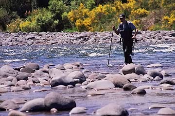 Die kleine Wanderung entlang des Cluthas bis zur Kennzeichnung der Fly-only Strecke fiel aufgrund des herrlichen Panoramas nicht schwer. Der Trampelpfad führte am grünen Ufer des natürlichen Flußverlaufes entlang, Sonne und Wind spielten mit den Blättern der hohen Bäume. An einem gelben Poller, der die Fly-only Strecke kennzeichnet, nimmt der Clutha eine Breite von ca. 90 Meter ein. Dort findet sich eine Abbruchkante, eine kleine Furt zur Mitte des Flusses, und etwa 70 Meter flussab eine mächtige Rieselstrecke. Das glasklare Wasser verschleierte jedoch den ernormen Strömungsdruck, ebenso die von mir geschätzten Tiefen des Wassers lagen jenseits dessen, was man als Watfischer bewältigen kann. Ich begann mit einigen Rollwürfen, hielt den Watstock Links fest im Griff, und hatte Mühe, auf den Füßen zu bleiben. Außerdem gab es verschiedenen Stellen keinen Fisch zu sehen. Enttäuschung stieg in mir auf, da gibt es Besseres. Die angekündigte Fly-only Strecke taugte an diesem Tag wohl mehr als Rafting und Wildwasserkanustrecke. |
