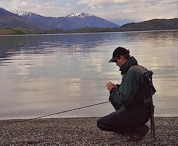 Zwei Tage Dauerregen machten alle Flüsse der Umgebung Fly-fi unbrauchbar. In Glendhu Bay rastete ich auf einem Motorcamp. Am Nachmittag verzogen sich die Wolken und ich konnte im Abendlicht den Lake Wannaka mit seinen umliegenden schneebedeckten 3000ern genießen. Die 8er Rute ausgepackt, in die Wathose geschlüpft, und rein in die herrliche Abendstimmung. Etwa 10 Meter konnte ich hineinwaten, ohne Probleme zu bekommen. Vor meinen Füßen zog eine 60er Forelle vorbei. Der erste Fisch, den ich auf der Reise gesehen hatte. Weiter draußen durchbrachen einige Forellen die spiegelglatte Oberfläche. Gerade warmgeworfen, da schluckte mich auch schon die Dunkelheit, und beim Rückschwung spürte meine Fliege immer häufiger die Äste, der hinter mir liegenden Baumgruppe. |
