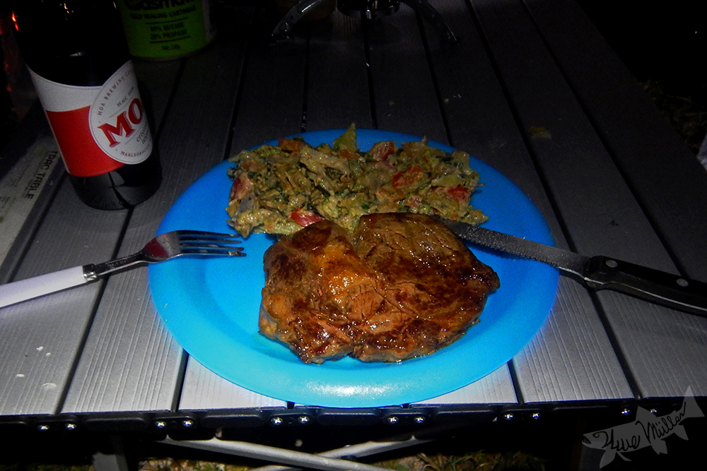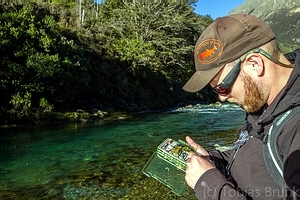 | Mit Mikes professionellen Tipps gelingt es mir, meine Fischerei weiter zu verbessern. Am Abend des Tages bauen wir unser Zeltlager auf und bekommen Besuch von einem Wekaralle, der unsere Mitbringsel nach Fressbaren durchwühlt. Am nächsten Morgen bemerkt Mike das Fehlen seines Watschuhs. Der Weka hat diesen verschleppt und einige Meter entfernt unter einem Busch abgelegt. Zur Fischerei selbst muss ich eigentlich nicht viel erzählen. Die Bilder zum Gewässer sprechen für sich selbst. |