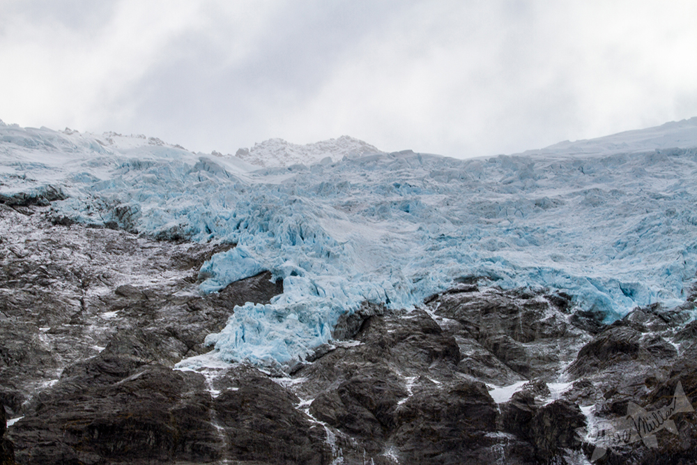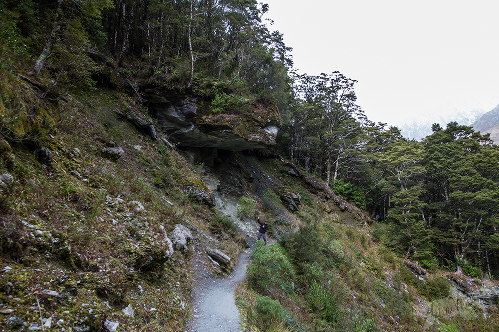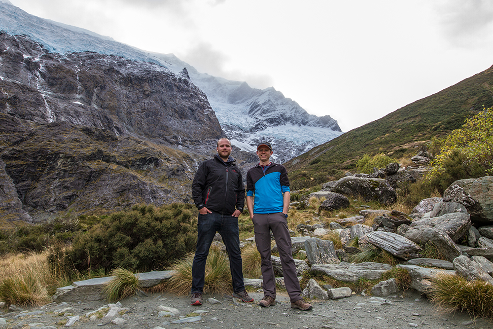 | Tag 5 und unser letzter Tag. Von Wanaka fahren wir Richtung Westen über die Glendhu Bay zum Mount Aspiring. Bei winterlichen Temperaturen unternehmen Tobias und ich noch eine Wanderung, um die fantastische Natur noch einmal zu erleben. Wir überqueren den Matukituki River und wandern auf einem gut befestigten Weg durch einen dichten Regenwald. Ehe wir nach einer Weile die Waldgrenze erreichen, hier eröffnet sich vor uns das Rob Roy Tal. Da stehe ich nun also vor dem Rob Roy Glacier und blicke auf emotionale und aufregende Monate zurück. |