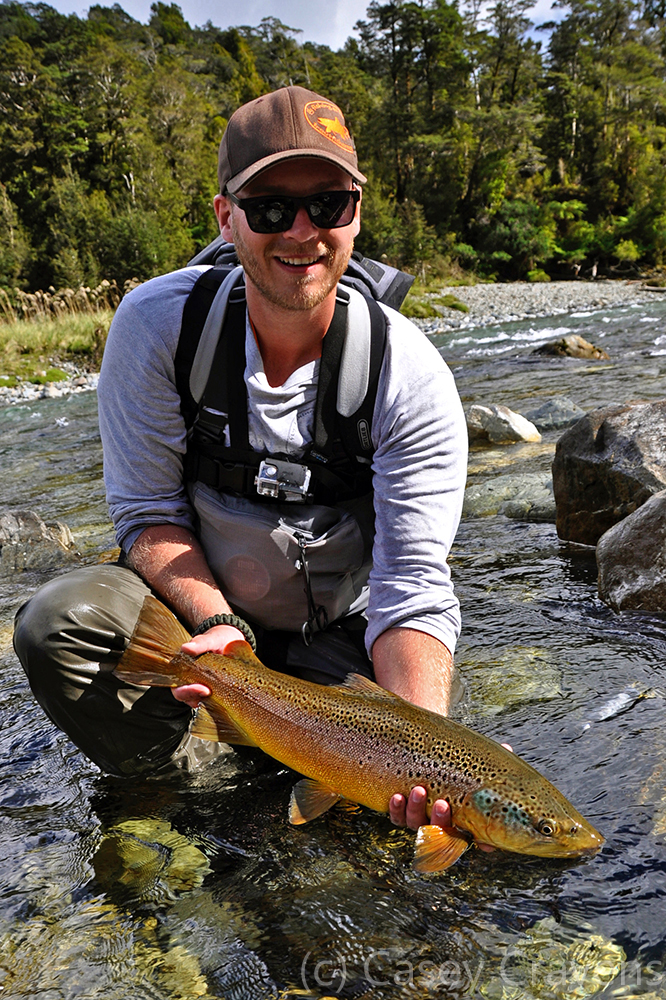 | Früh am Morgen, ja, wirklich früh am Morgen holt mich Mike ab und wir fliegen mit dem Helikopter in den Kahurangi National Park. Unser Ziel ist ein mittelgroßer Fluss des Karamea Systems. Der Kahurangi National Park ist dicht bewaldet und so sind nur vereinzelt Flussabschnitte sichtbar und als Landeplatz geeignet. Am Schlafplatz für den Abend laden wir unsere Ausrüstung aus, ehe der Pilot uns weiter flussabwärts absetzt. Nach kurzer Zeit am Wasser hören wir wieder Rotoren-Geräusche und sehen einen Helikopter über uns herfliegen. Wie sich später herausstellte, handelte es sich dabei um einen anderen Guide, der sich letztendlich einfach vor uns setzte und den Gewässerabschnitt, den wir befischen wollen, abfischt. Sichtlich sauer, lässt Mike seinen Frust Luft. Nachdem wir keine andere Möglichkeit haben, machen wir das Beste aus der Situation. Nachweislich sind weniger Fische aktiv, aber uns gelingt es trotzdem, einige schöne Tiere zu überlisten und zu fangen. |
