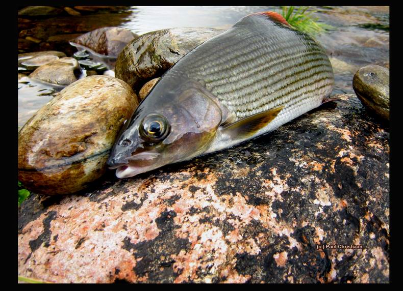 | An der Glomma angekommen und rasch fertig mit dem Aufbauen der Fliegenrute, sah ich beim Blick auf's Wasser einen Ring in der harten Strömung. Schnell knotete ich meine Favorit-Trockenfliege ans Vorfach und servierte sie weit draußen in der Strömung. Mit einen hohen Sprung in die Luft jagte eine schöne Äsche auf die Fliege und nahm sie. Der Fisch kämpfte stark und und blieb in der harten Strömung einfach stehen, bis ich ihn schließlich durch stetigen seitlichen Zug aus der Strömung bekam. Endlich konnte ich zur Landung ansetzen und den schönen Fisch in meine Hand legen. |
