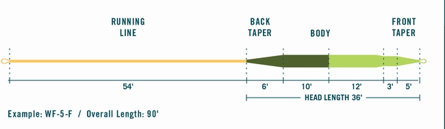 6,20 m hellgrüne Spitze 4,95 m dunkelgrünes Hauptbelly 3 m Rear Taper im tanfarbenen Schnurteil 16,45 m Running Line tanfarben |