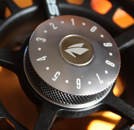 | Die 2250 Reel besitzt ein zuverlässig arbeitendes Carbon-Scheibenbremssystem, welches vollständig versiegelt im Rollengehäuse untergebracht ist. Mit Hilfe des großen (36 mm Durchmesser) runden und gut bedienbaren Bremseinstellrades auf der Rollenrückseite lässt sich die Bremse in nur einer knappen Umdrehung schnell und einfach von "offen" bis "mittelkräftig" regulieren. Durch die Beschriftungsskala von 1 - 9 des Bremseinstellrades lässt sich jede einmal gewählte Bremseinstellung zuverlässig und schnell jederzeit wieder herstellen und durch einen festen vorderen und hinteren Anschlag der Bremseinstellung kann die Bremse auch nicht z.B. mit Gewalt überdreht werden. Unser Brems-Testwert (maximales Abzugsgewicht in Kilogramm bei vollständig geschlossener Bremse und bei gefüllter Spule) ergibt in der werkseitigen Einstellung einen Wert von um 1,0 Kilogramm. Das ist vergleichsweise kein hoher Wert, reicht aber für das Einsatzgebiet dieser Rolle und deren Schnurklasse mehr als aus. Ein absolut ruckfreies, sanftes Anlaufen der Spule ist bei jeder Bremseinstellung gewährleistet. Im Betrieb lässt die Rolle in beiden Laufrichtungen ein dezentes "Schnurren" hören. Der Spulenwechsel ist sehr einfach: die Spule wird einfach von hinten nach vorne aus dem Gehäuse gedrückt und beim Wiedereinsetzen ebenso einfach wieder eingerastet: ermöglicht wird dies durch einen "O-Ring". Im Praxisbetrieb zeigte unser Testmodell einen korrekten, sehr gut ausgewuchteten und völlig schlagfreien Rundlauf, auch bei höheren Abzugsdrehzahlen. Jedes technische Detail an der SAGE 2250 funktioniert leichtgängig und zuverlässig. Am Rollenfuß gehalten, zeigt sich die Rolle als ordentlich ausbalanciert, mit einer geringen Neigung zur Kurbelseite hin. |